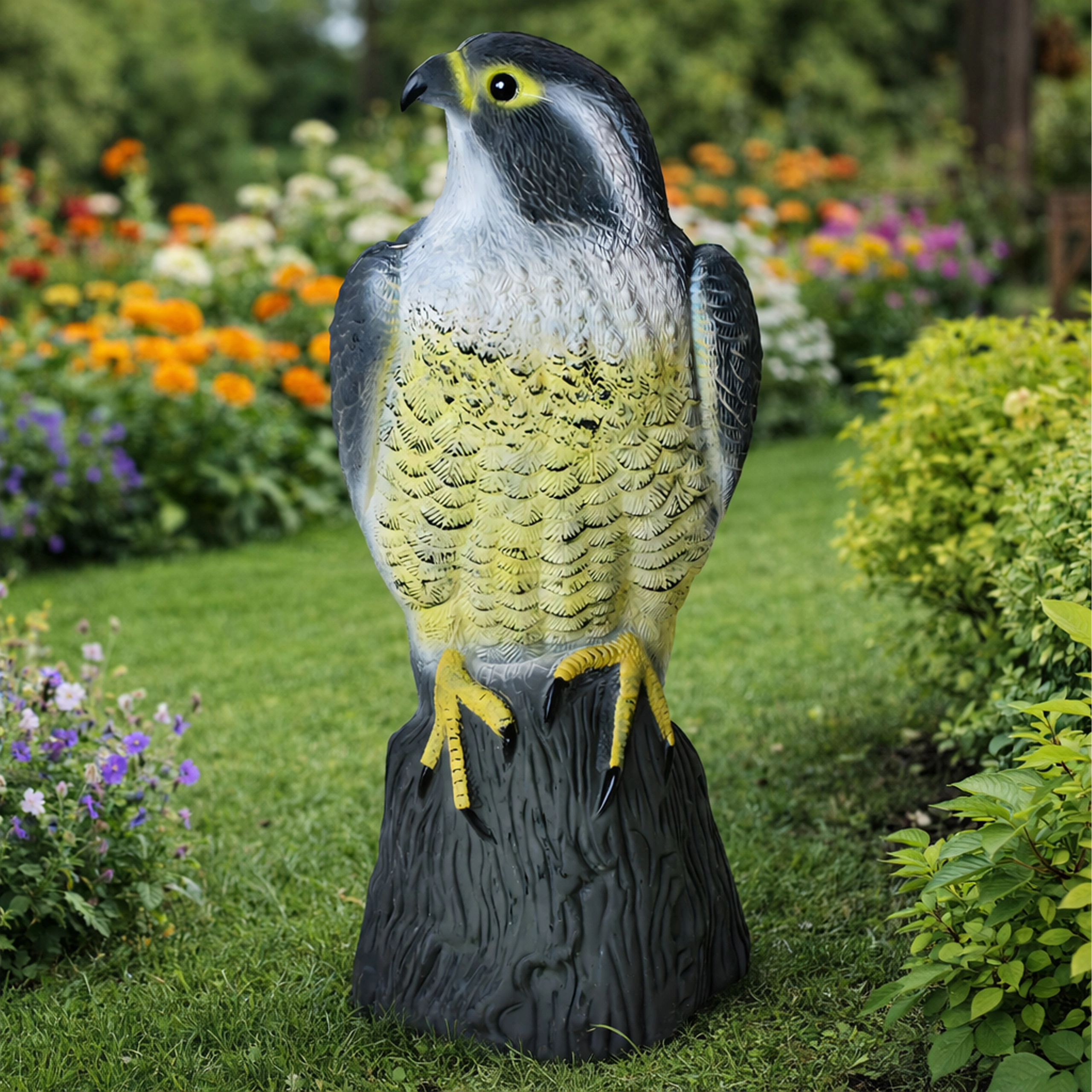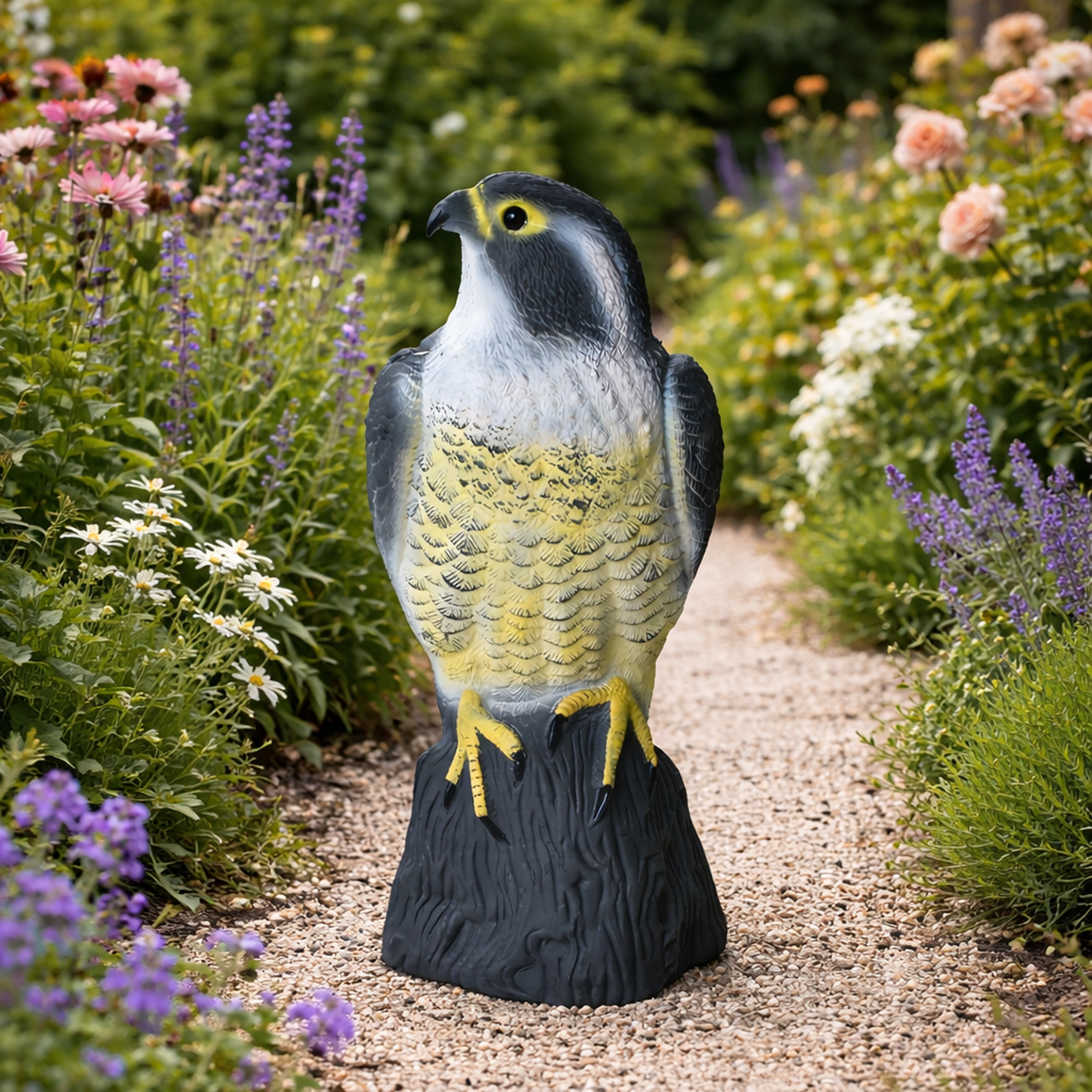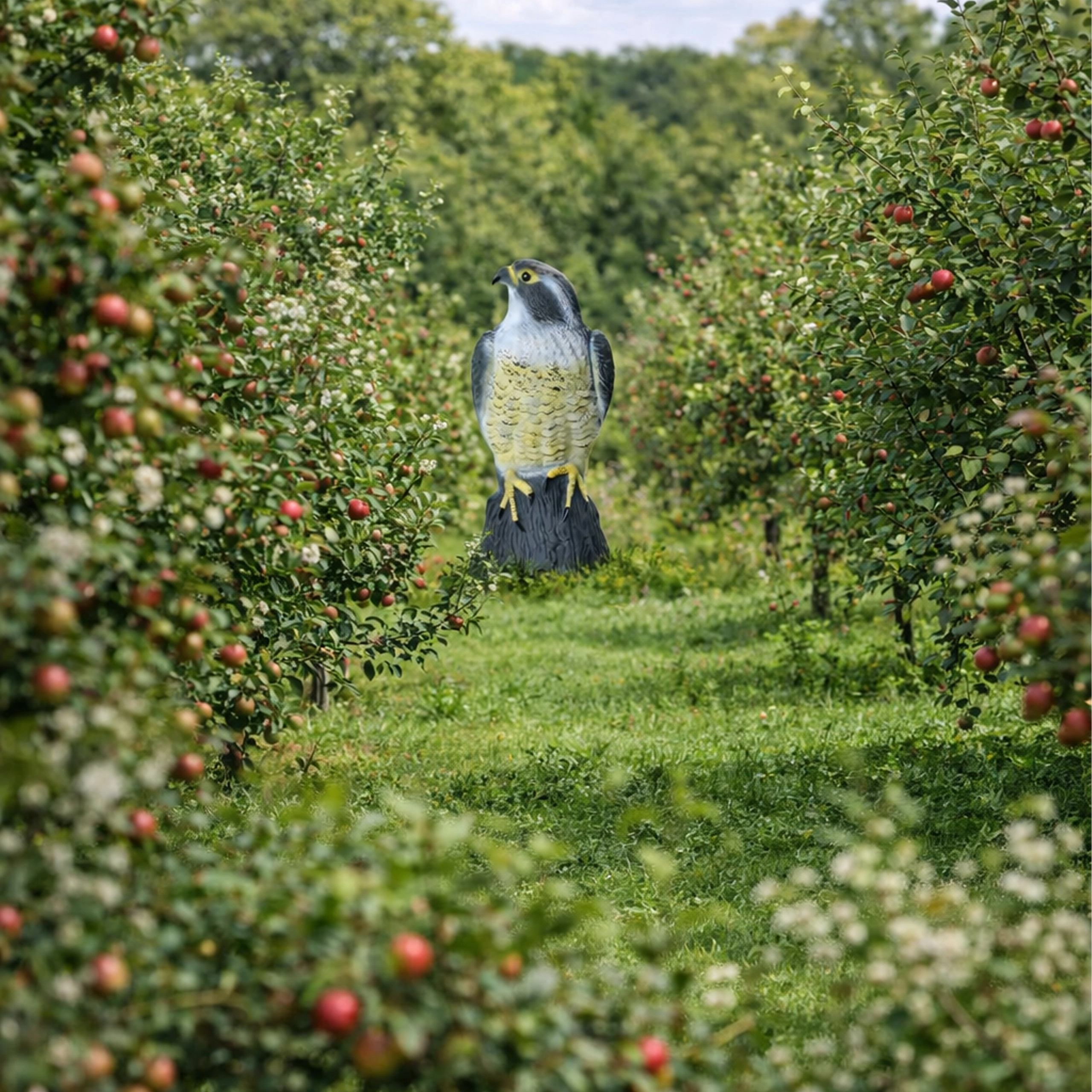 De natuurgetrouwe kleuring, verenstructuur en natuurlijke houding van de valk versterken het psychologische effect op kleinere vogels en voorkomen dat ze landen.