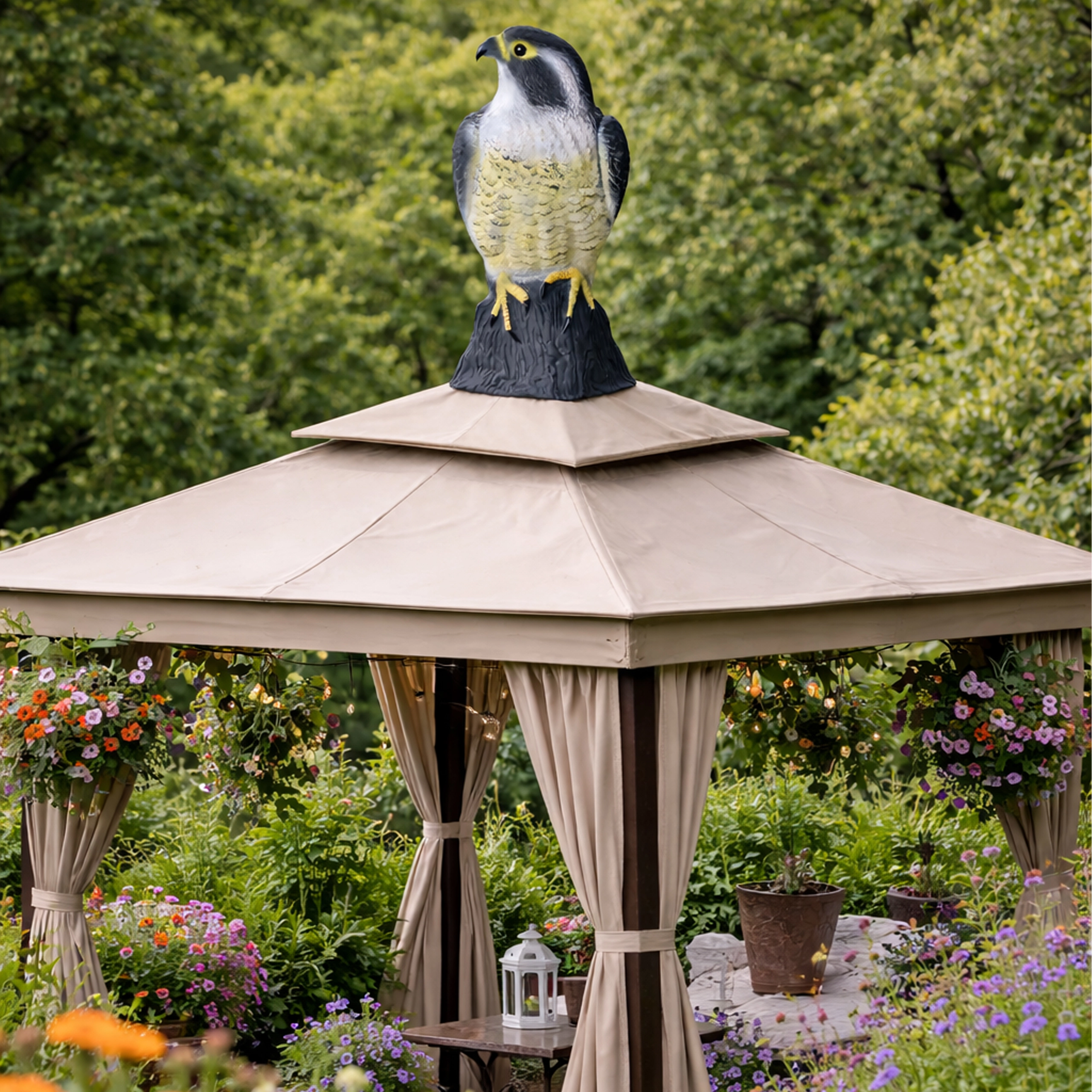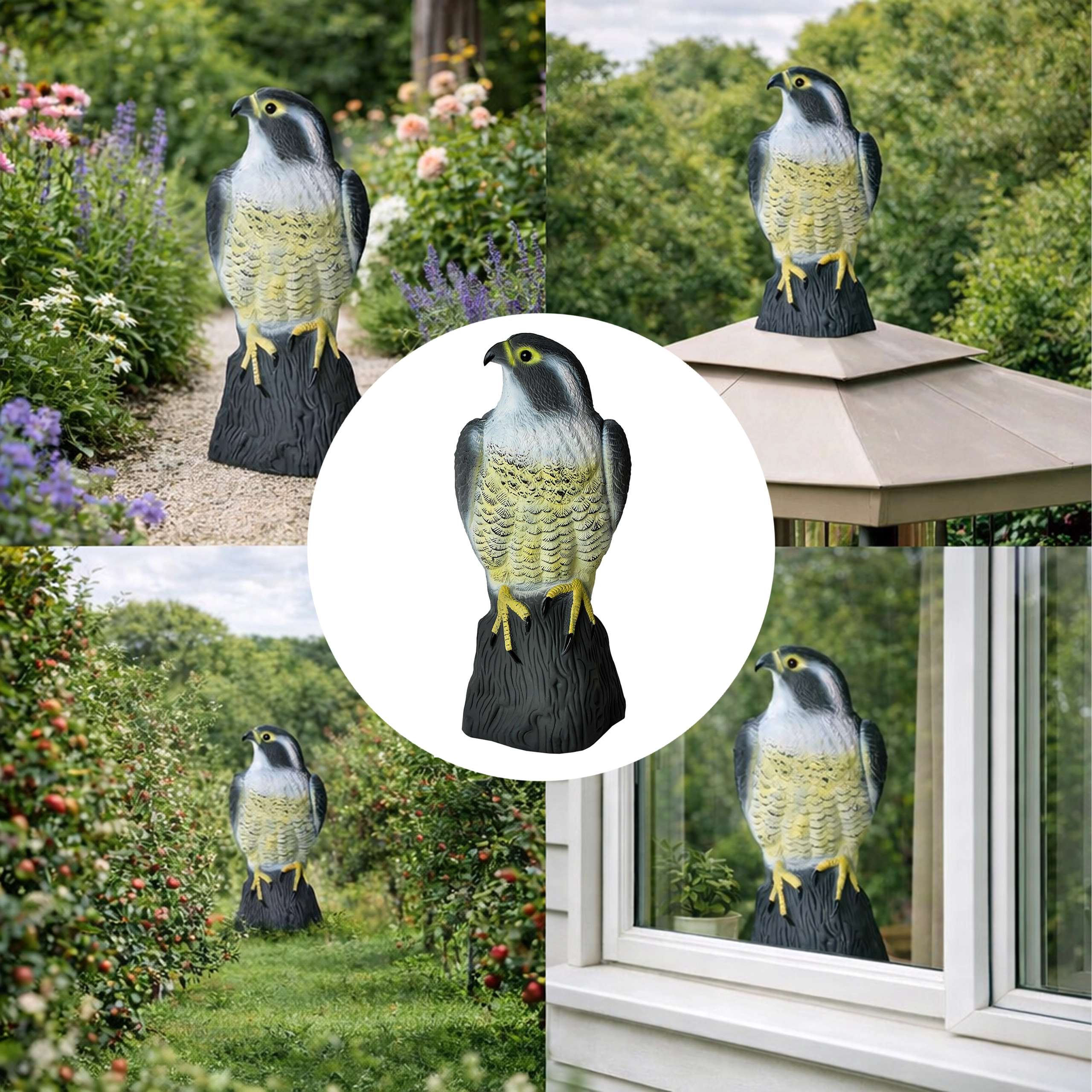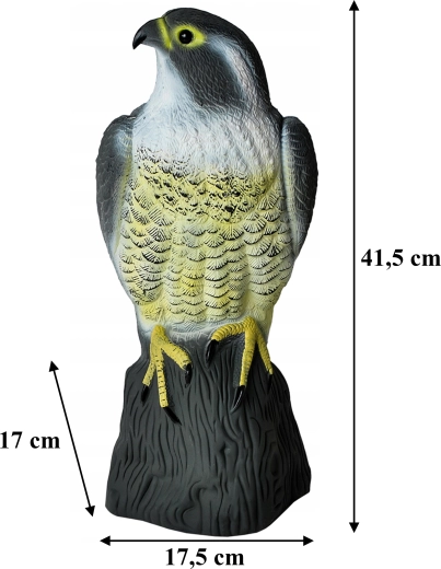 Het model is gemaakt van duurzame kunststof die geschikt is voor gebruik buitenshuis het hele jaar door. De stabiele voet maakt het eenvoudig om hem op vlakke oppervlakken te plaatsen (vensterbanken, leuningen, daken, terrassen, kassen, perken). Verplaats hem af en toe naar een andere plek voor maximaal effect, zodat vogels niet aan de aanwezigheid gewend raken.