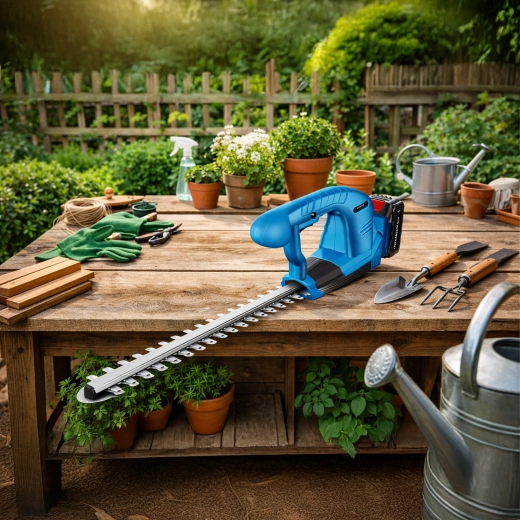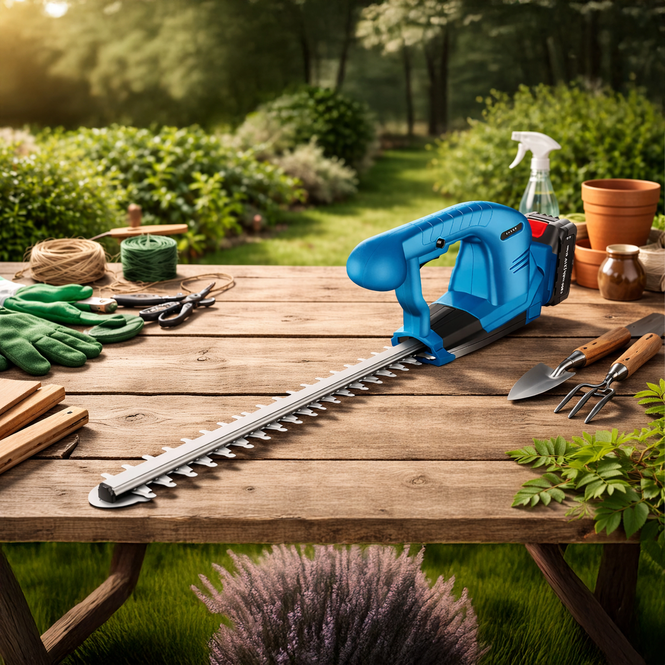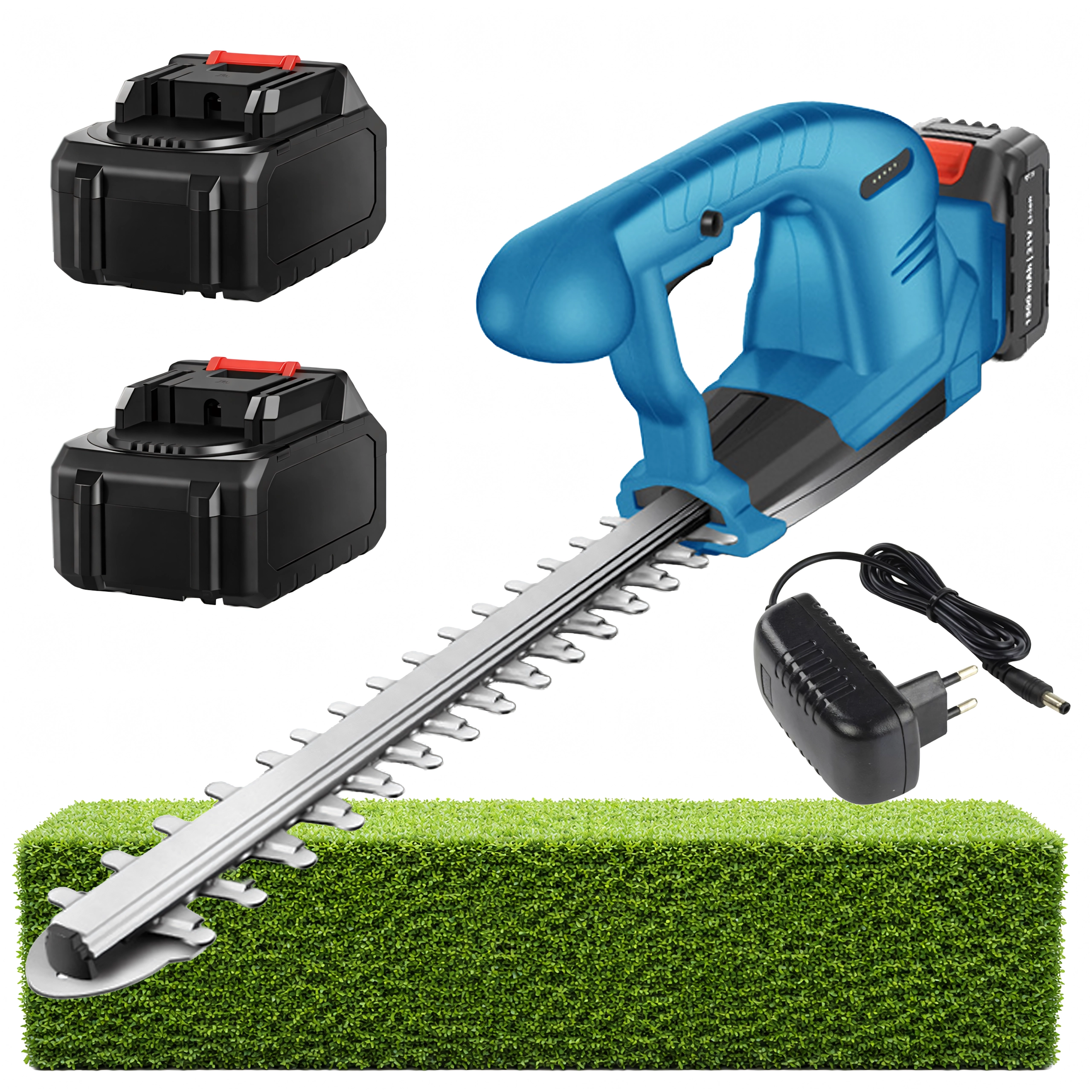 De set bevat twee oplaadbare accu’s en een oplader, zodat u kunt wisselen en langer doorwerken zonder onnodige pauzes. De schaar is licht, goed uitgebalanceerd en geschikt voor zowel vormsnoei als onderhoudssnoei van hagen en sierstruiken.