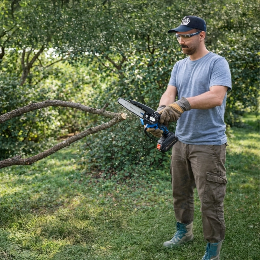 De compacte accu mini-kettingzaag is ideaal voor het snel snoeien van takken, het zagen van kleinere blokken en tuinwerk. Dankzij de lichte constructie en ergonomische handgreep biedt hij eenvoudige bediening, draadloze draagbaarheid en veiliger zagen met een kettingbeschermkap. Een uitstekende keuze voor hobbygebruik en regulier onderhoud van bomen en struiken.