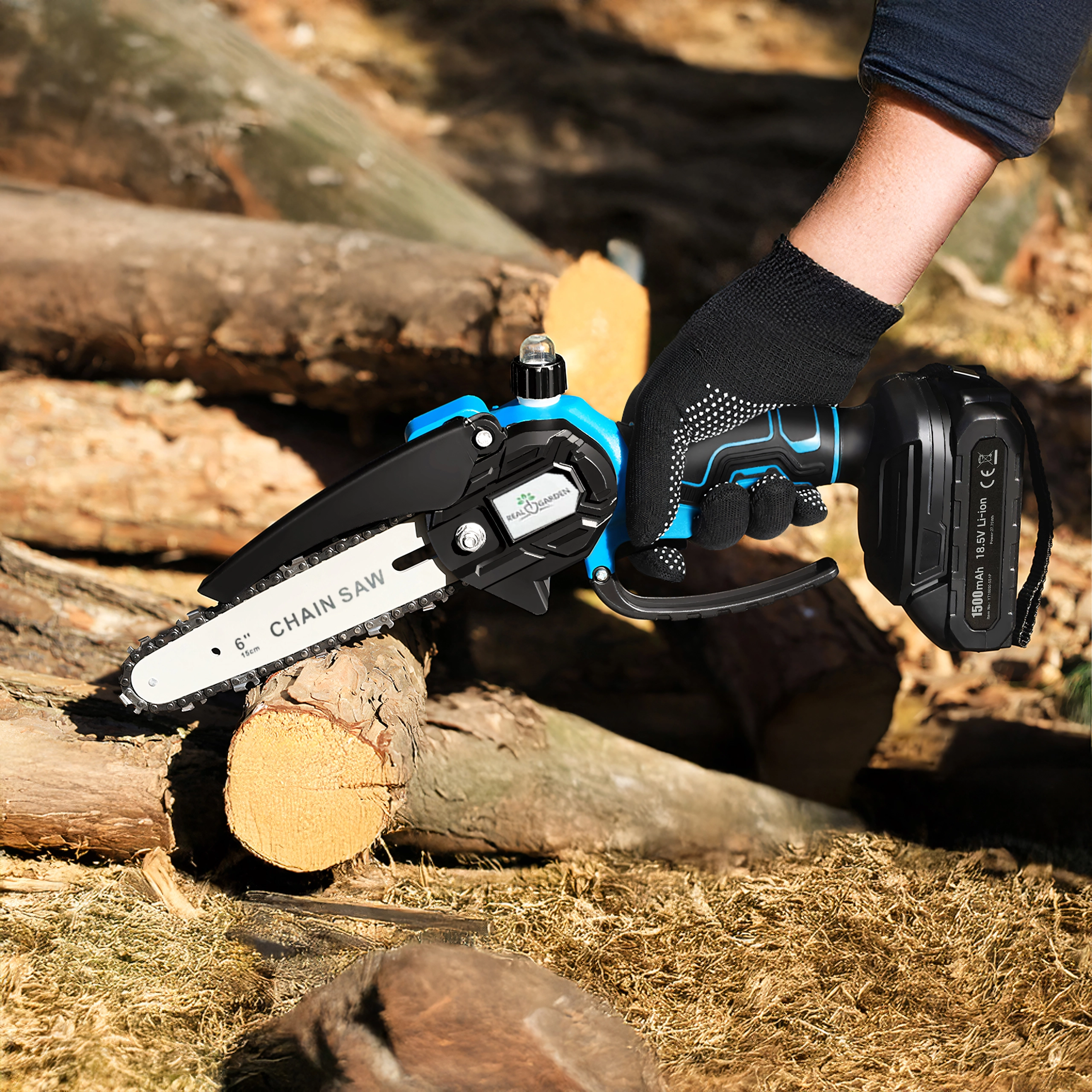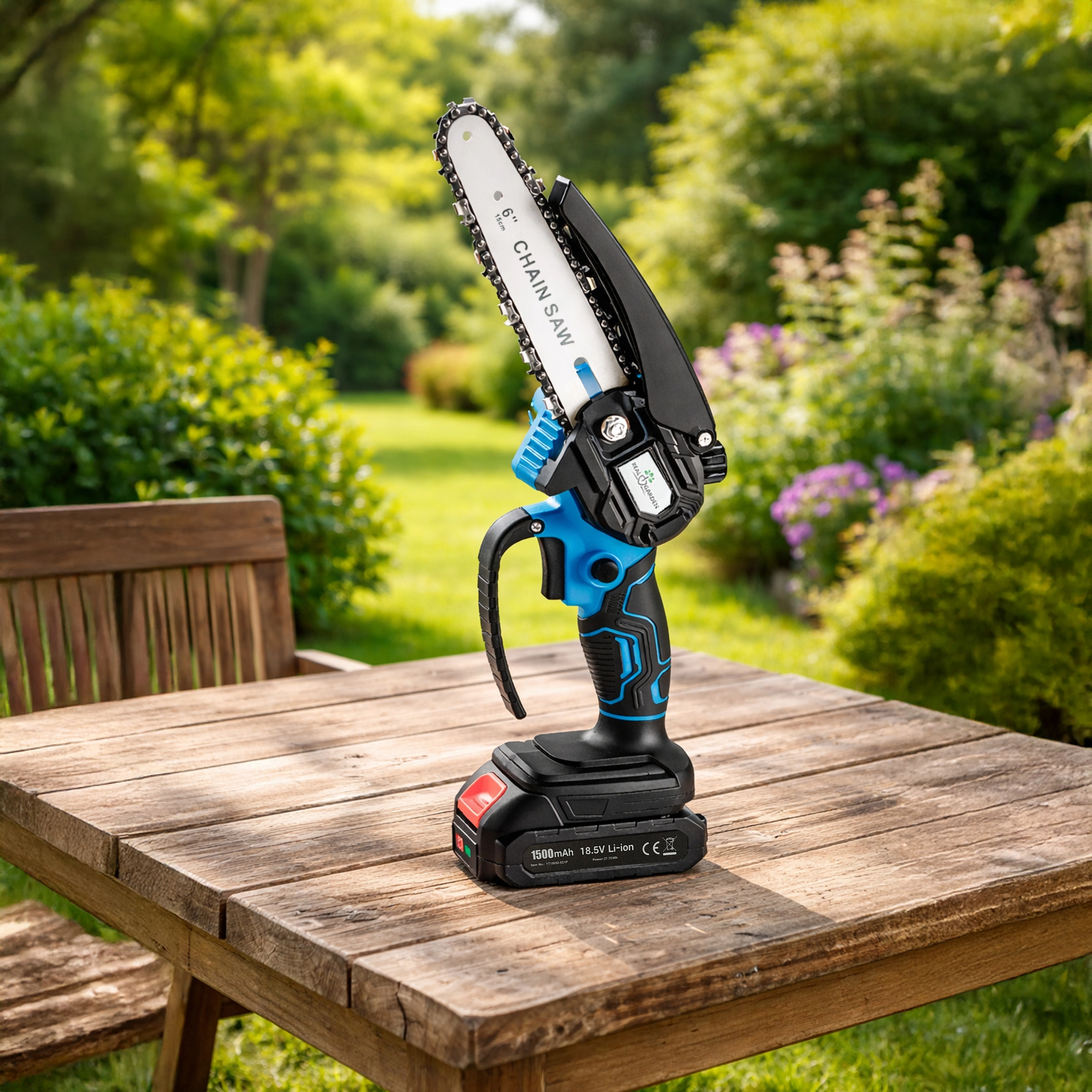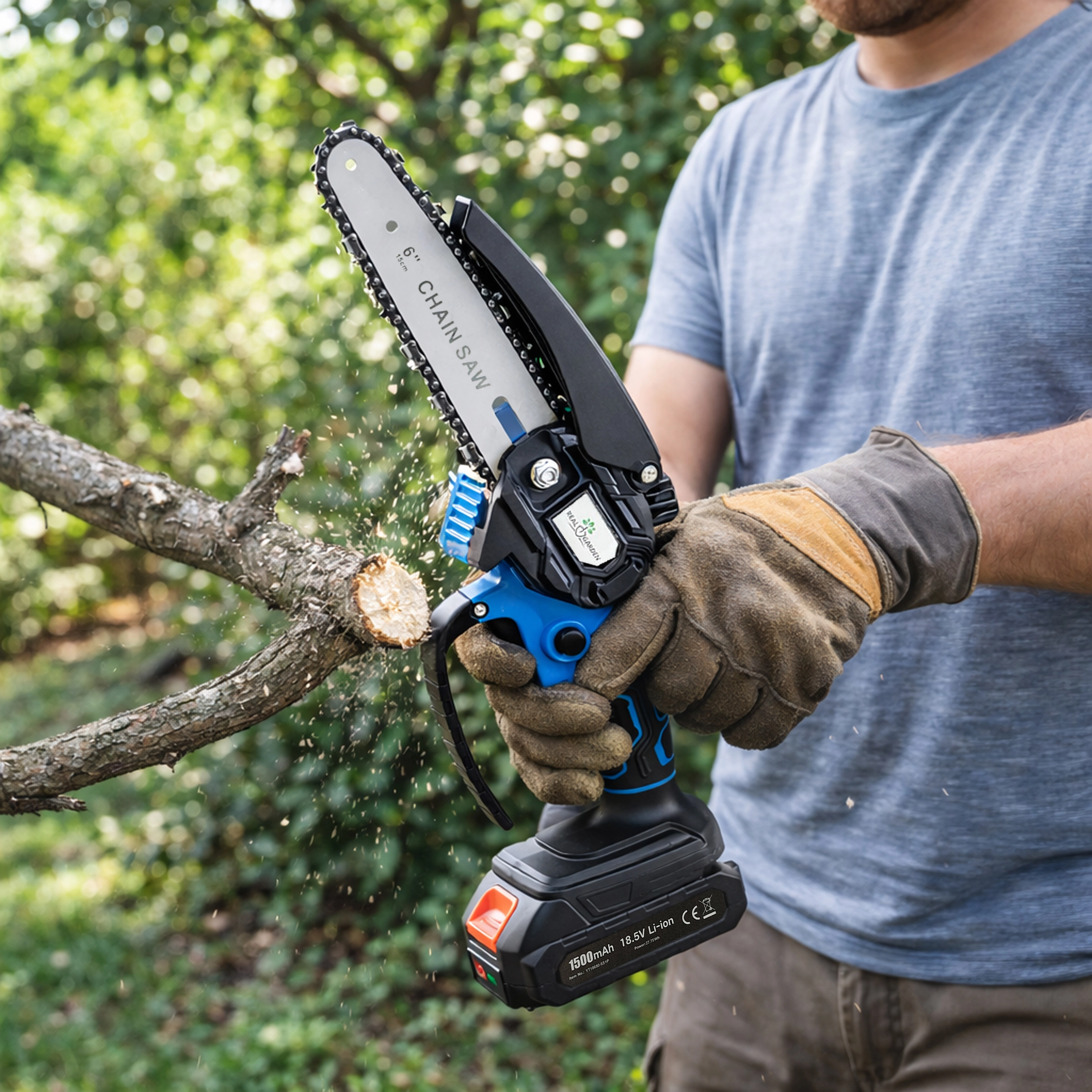 Een 6" geleider met een scherpe ketting zaagt takken en kleinere blokken snel en schoon – ideaal voor tuinonderhoud zonder onnodige inspanning.