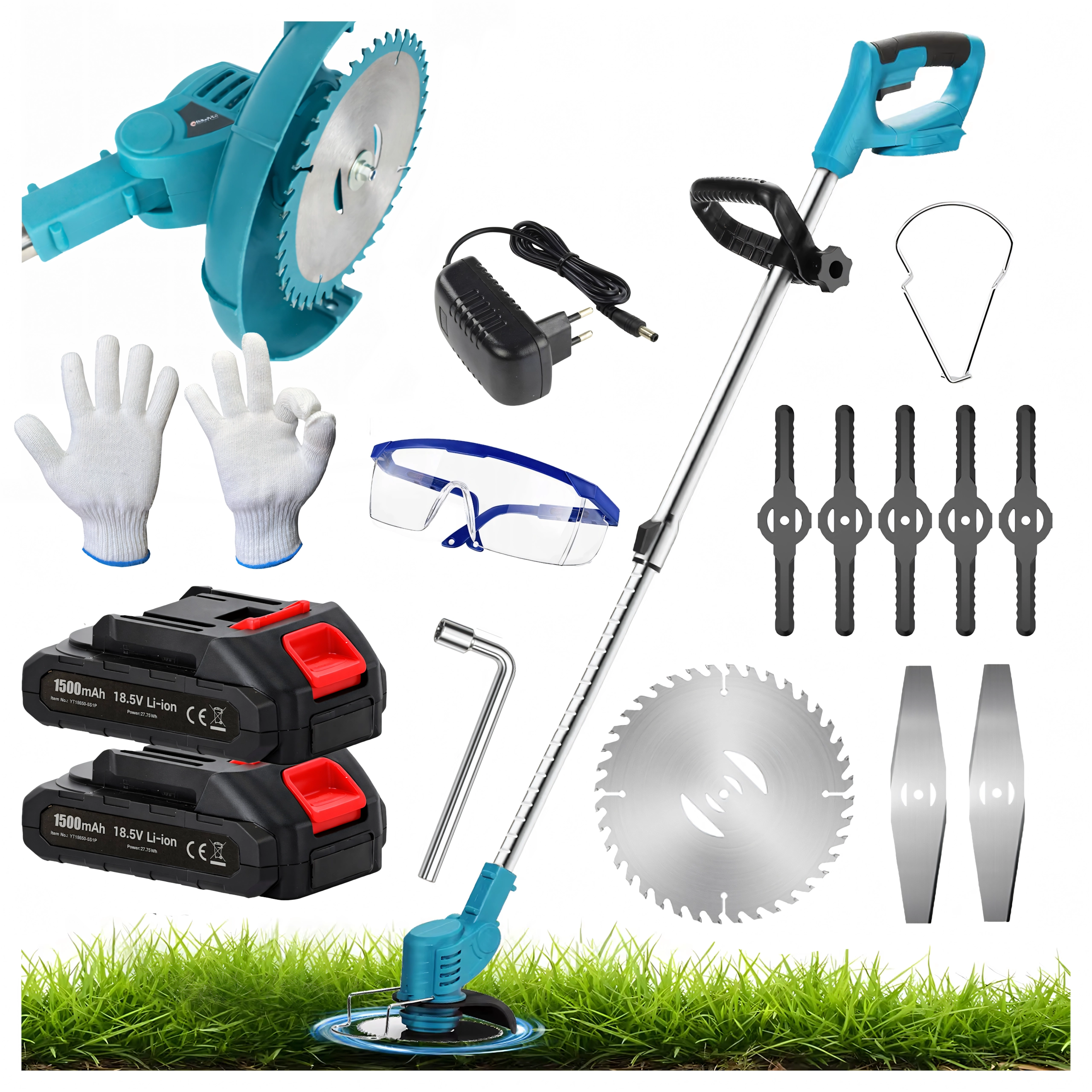 De uitgebreide set bevat verwisselbare messen (kunststof voor fijn maaien, metalen en zaagbladen voor dichtere begroeiing), 2× Li‑ion accu, lader en beschermingsmiddelen. De veiligheidskap voorkomt wegspattend vuil en de ergonomische constructie vermindert vermoeidheid bij langer werken.