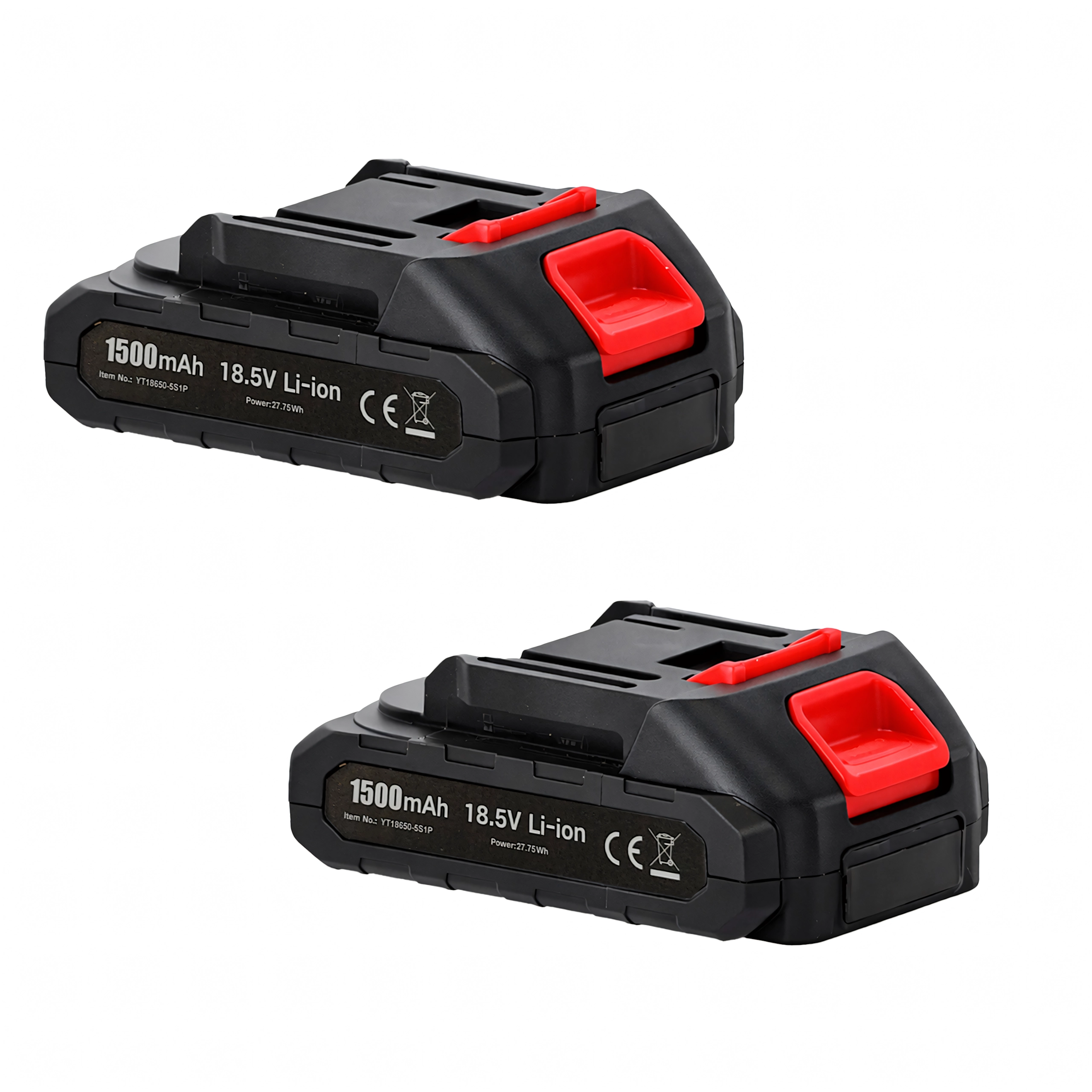 De set bevat 2× Li‑ion accu voor soepel afwisselen en langer ononderbroken werken in de tuin.