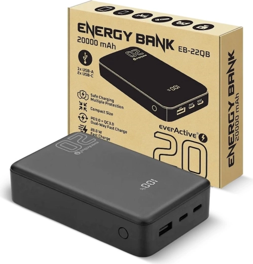 Betrouwbare energiebron voor op reis en op kantoor. Deze powerbank met 20.000 mAh en tot 20 W vermogen laadt moderne smartphones, tablets en kleine elektronica snel op. Dankzij twee USB‑C‑poorten (invoer/uitvoer) en één USB‑A kun je tot drie apparaten tegelijk bedienen, terwijl het LCD‑display de batterijstatus nauwkeurig weergeeft.
