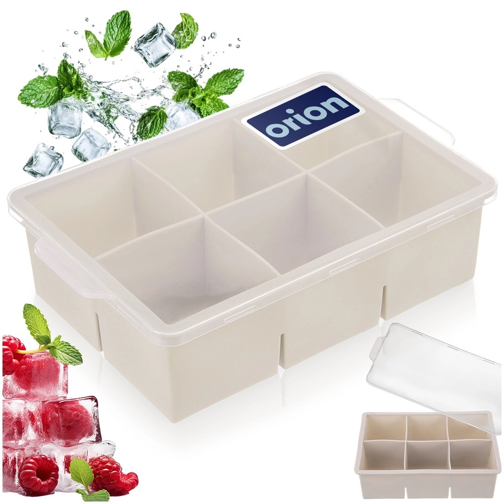 Ontdek de ideale vorm voor liefhebbers van perfect gekoelde drankjes. Deze beige siliconen vorm met deksel maakt zes XXL ijsblokjes van 5 × 5 × 5 cm die langzamer smelten en langdurige koeling bieden voor water, limonades, cocktails en hoogwaardige distillaten.