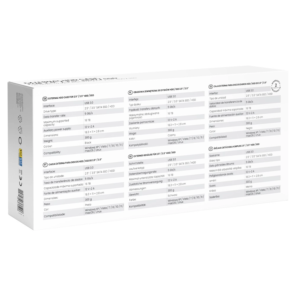 Het apparaat is universeel en werkt probleemloos met Windows (XP/Vista/7/8/10/11), macOS en Linux. Het ondersteunt schijven met SATA-interface in de formaten 2,5" en 3,5", zowel traditionele HDD’s als snelle en stille SSD’s. Voor de stabiele werking van 3,5" schijven is een 12 V / 2 A-voedingsadapter inbegrepen.