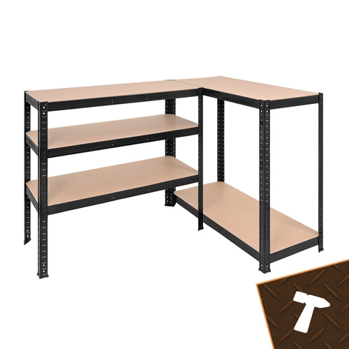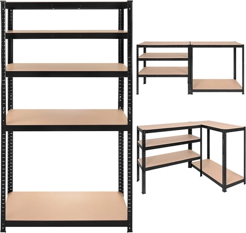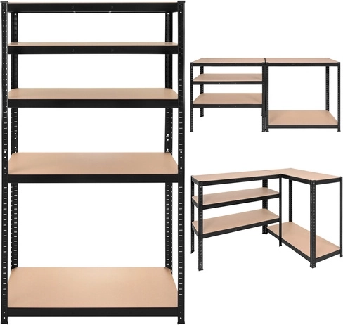 Bouw een hoog rek, twee lagere segmenten van 90 cm of een hoekopstelling. De hoogte van de planken is per 30 mm instelbaar voor perfecte aanpassing aan de opgeslagen items.