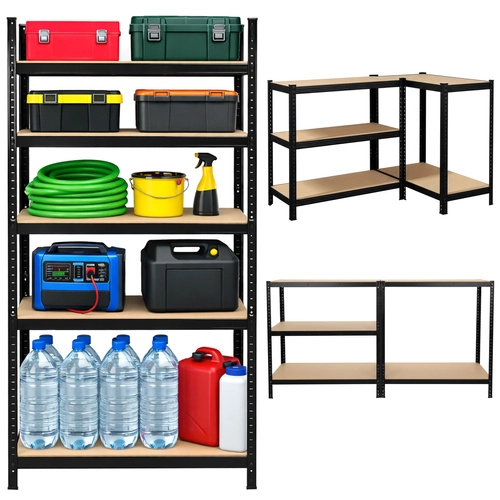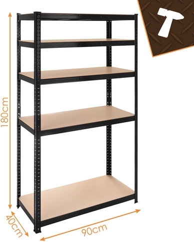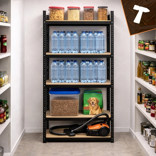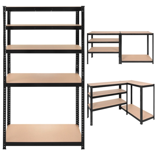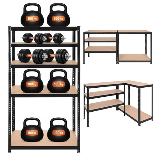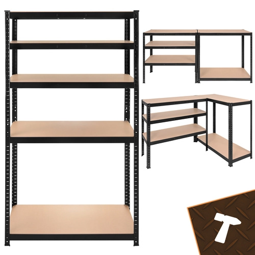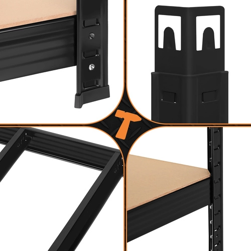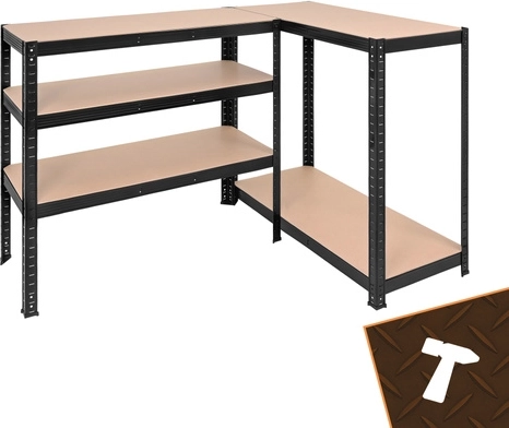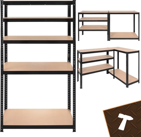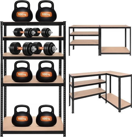 De montage is snel en schroefloos – de afzonderlijke elementen klikken in elkaar; een rubberen hamer volstaat. De planken zijn in hoogte verstelbaar per 30 mm, zodat u dozen, gereedschap, banden en voorraden eenvoudig kunt opbergen. Het 3-in-1-systeem maakt het mogelijk een hoog rek te bouwen, het te verdelen in twee lagere segmenten of een hoekopstelling te creëren voor maximaal ruimtegebruik.