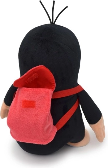 De mol is uitgerust met een rode rugzak die bijdraagt aan de speelsheid en interactiviteit van het speelgoed.