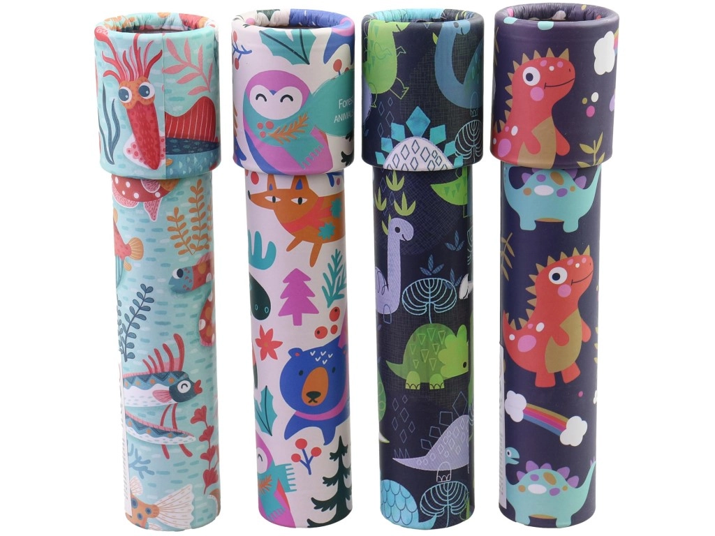 Prikkel de fantasie met een klassieke speelgoedfavoriet die nooit verveelt. Deze caleidoscoop creëert fascinerende, voortdurend veranderende patronen die nieuwsgierigheid, creativiteit en visuele waarneming stimuleren. Dankzij de vrolijke motieven in 5 varianten kunnen kinderen hun favoriete stijl kiezen.