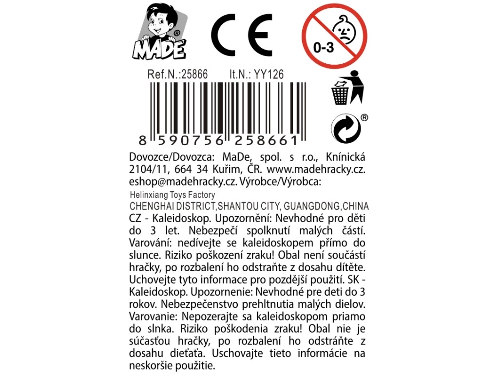Ontdek de magie van kleurrijke patronen met deze plastic caleidoscoop voor kinderen vanaf 3 jaar. Hij biedt 5 verschillende kleurrijke motieven, heeft geen batterijen nodig en is klaar voor direct speelplezier, waar dan ook. Dankzij de compacte afmetingen van 4,5 × 4,5 × 19,5 cm ligt hij fijn in kinderhanden en is hij ook een aantrekkelijke aanvulling voor een displaydoos in winkels.