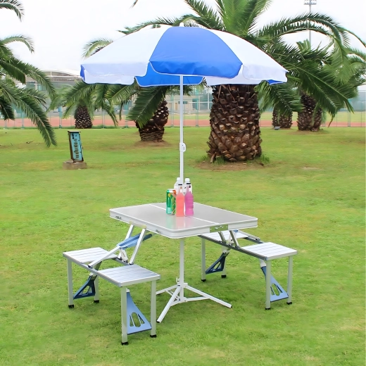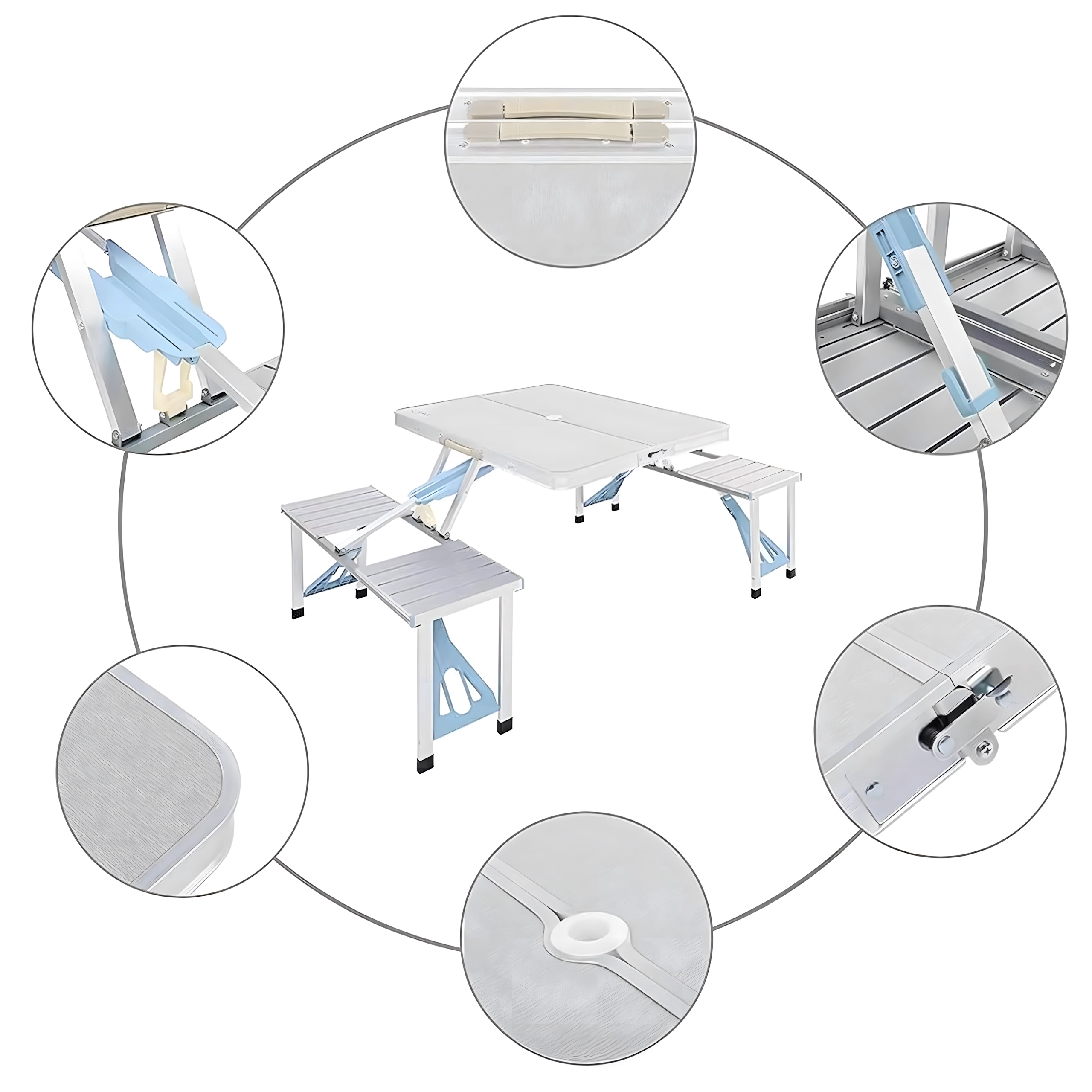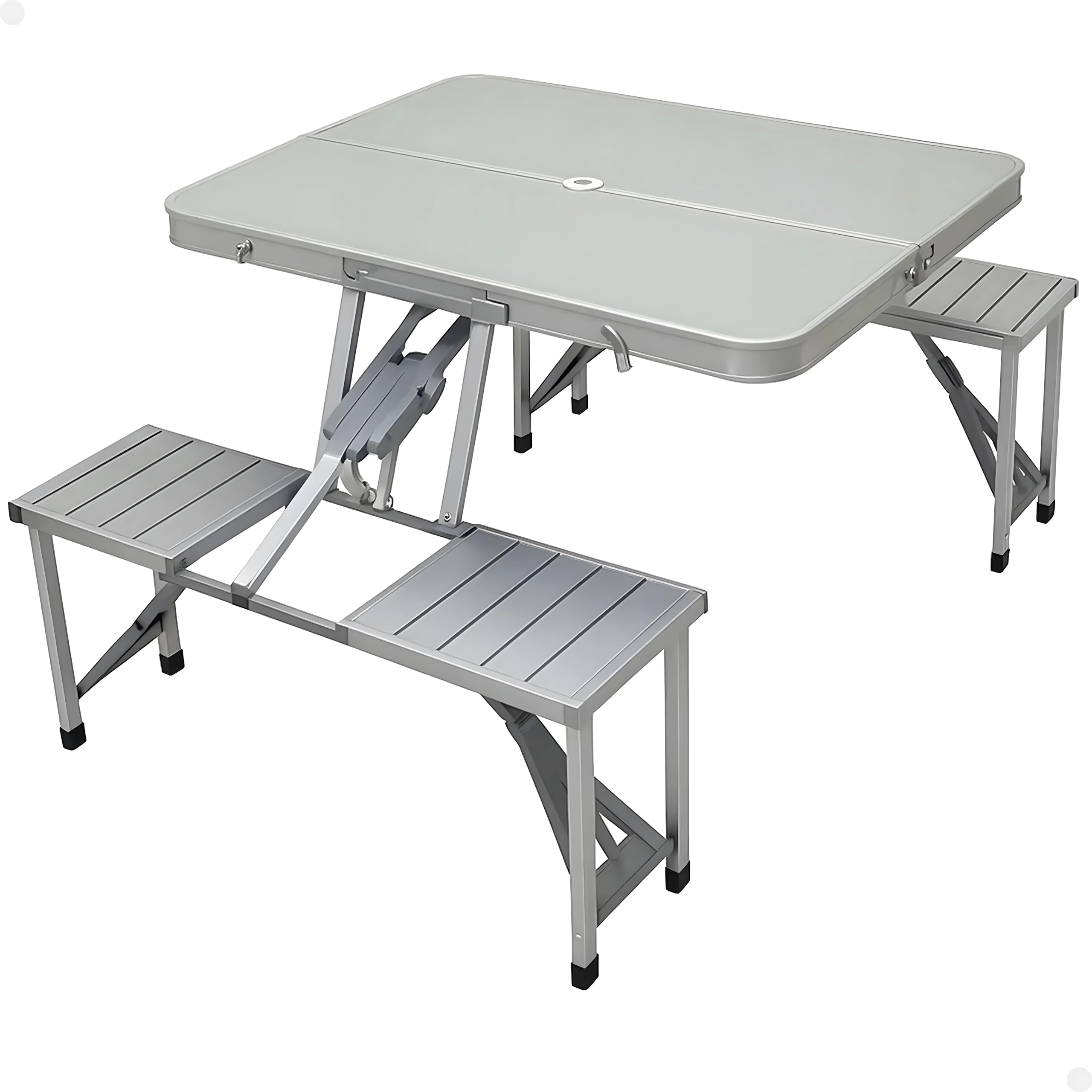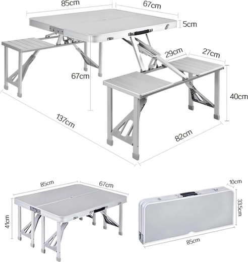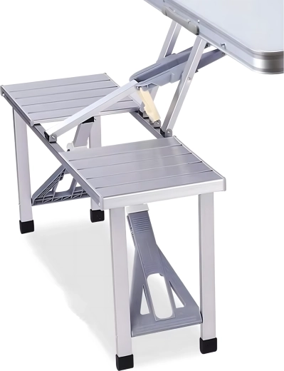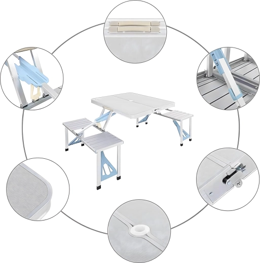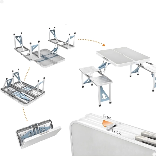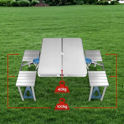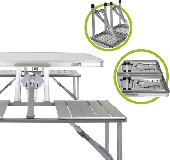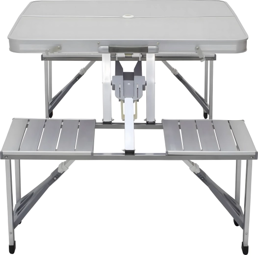 Praktische en lichte opvouwbare campingtafel met 4 geïntegreerde zitjes, ideaal voor picknick, kamperen, strand en tuin. De duurzame combinatie van aluminium en PVC garandeert een lange levensduur; na het inklappen verandert de set in een compacte koffer met handvat. De tafel heeft een parasolgat, zodat je ook op hete dagen kunt genieten van aangename schaduw.