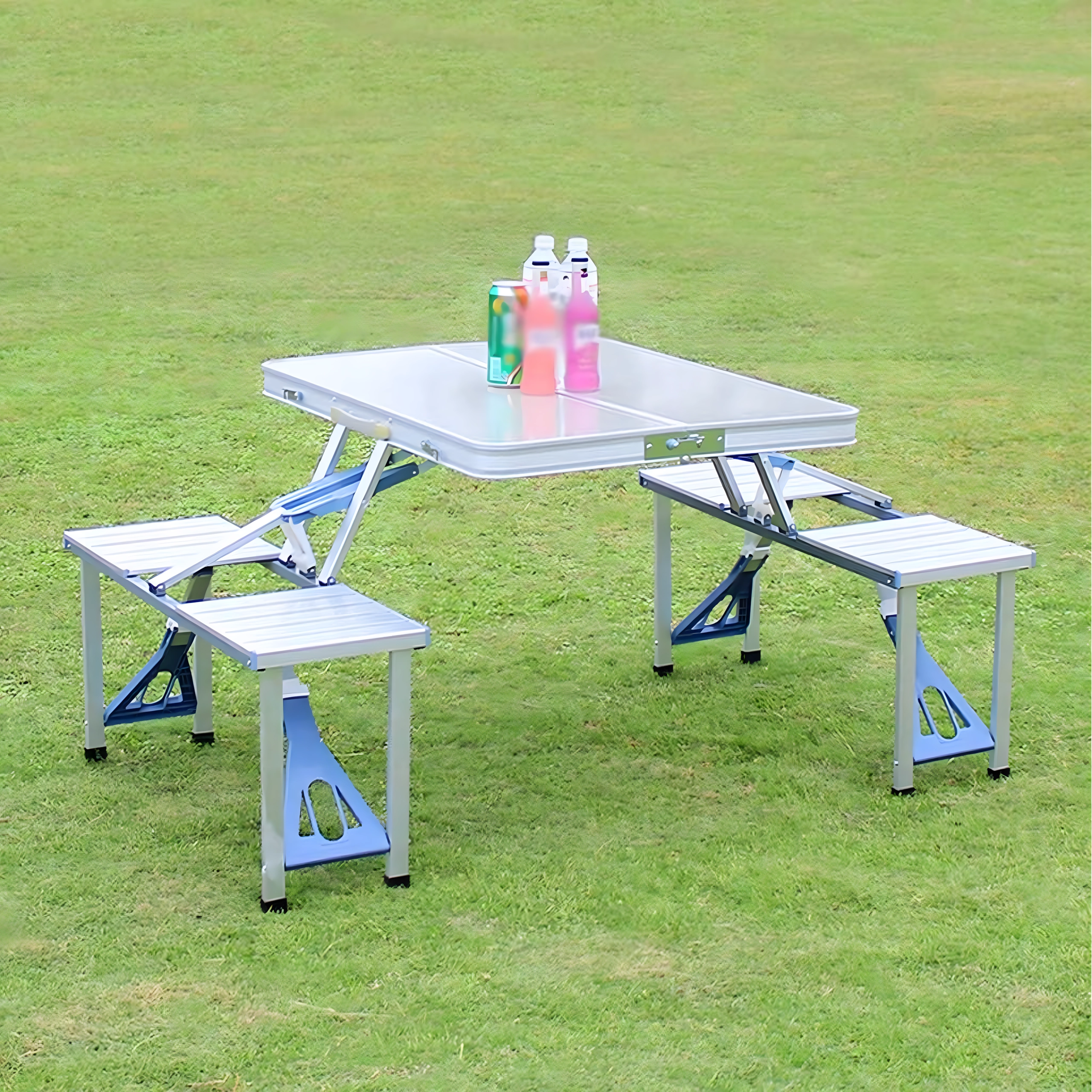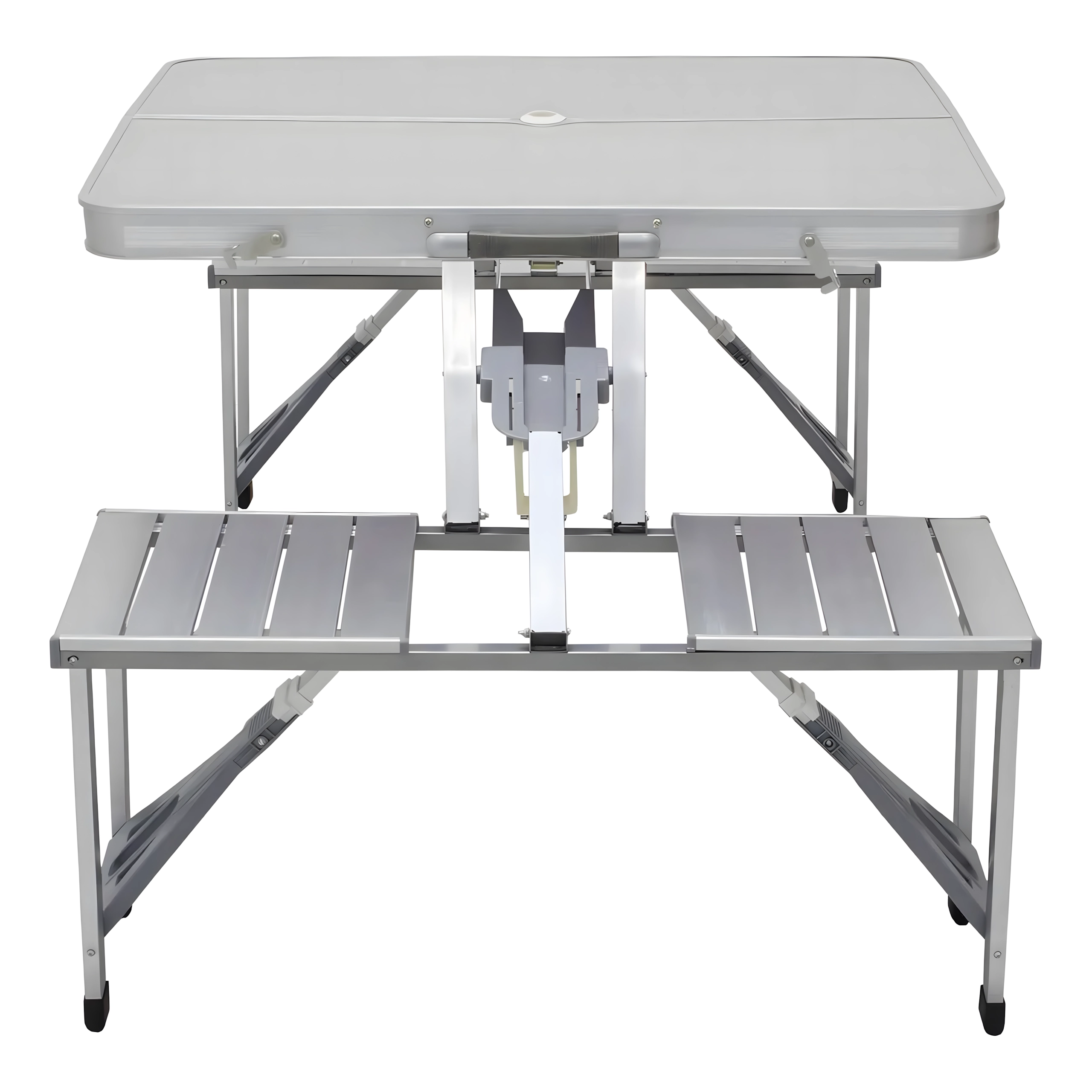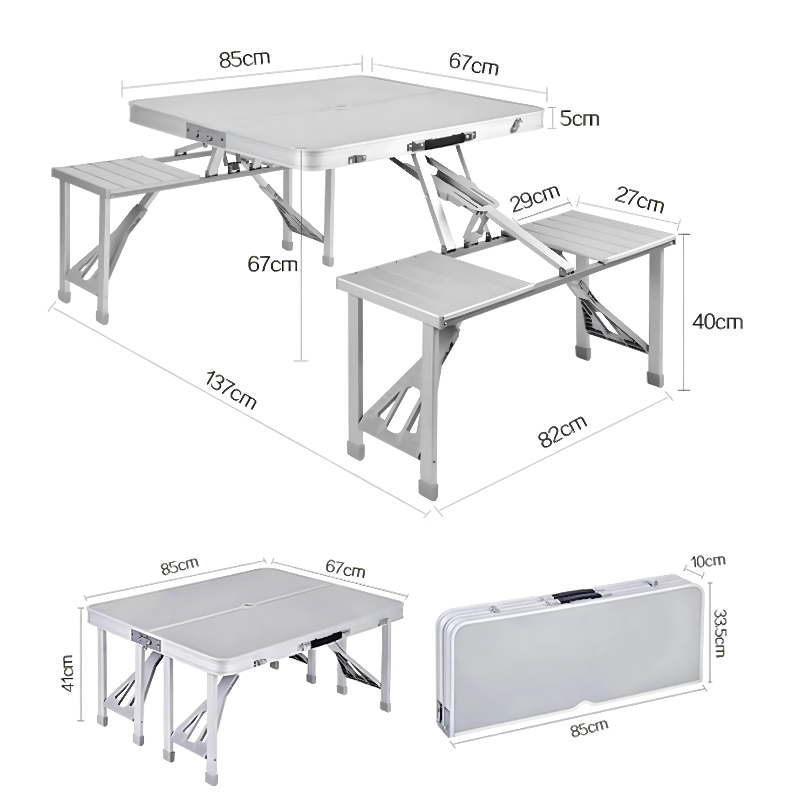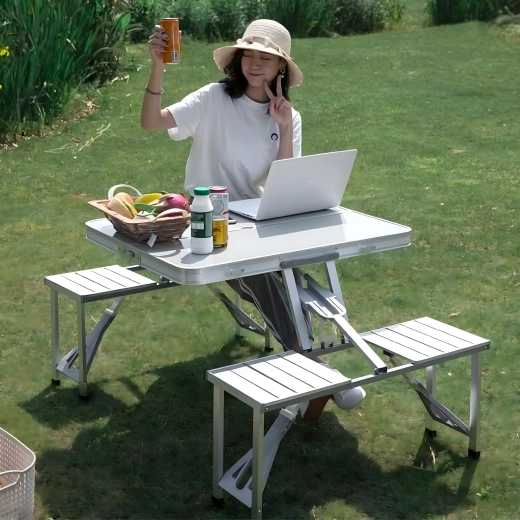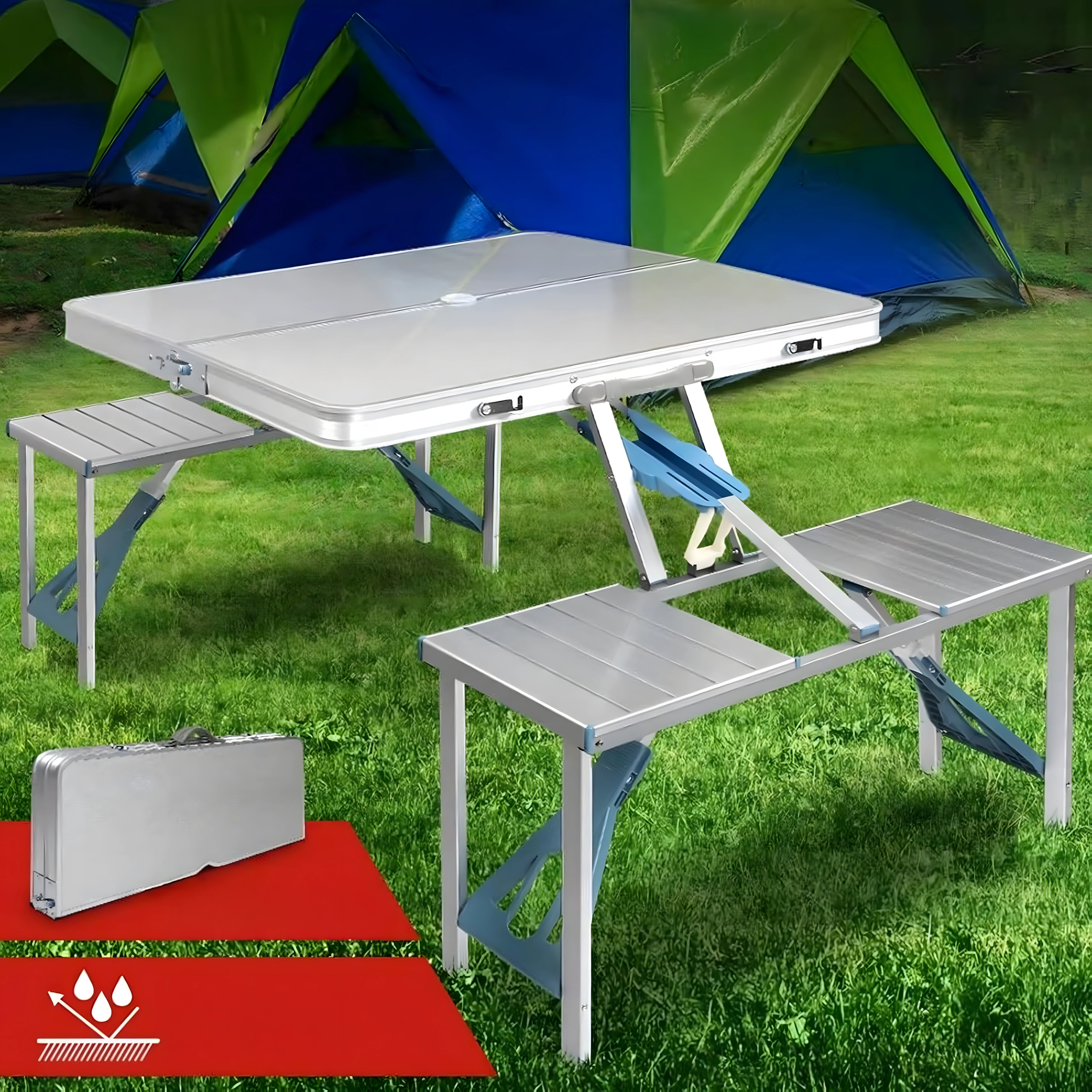 Praktische en lichte opvouwbare campingtafel met 4 geïntegreerde zitjes, ideaal voor picknick, kamperen, strand en tuin. De duurzame combinatie van aluminium en PVC garandeert een lange levensduur; na het inklappen verandert de set in een compacte koffer met handvat. De tafel heeft een parasolgat, zodat je ook op hete dagen kunt genieten van aangename schaduw.