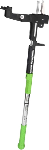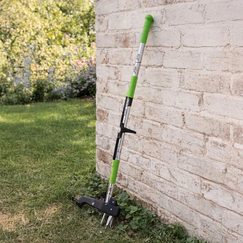 De lange telescopische steel en hefboom bij de kop maken staand werken mogelijk en sparen rug en knieën. Ideaal voor langere klussen op gazon en borders.