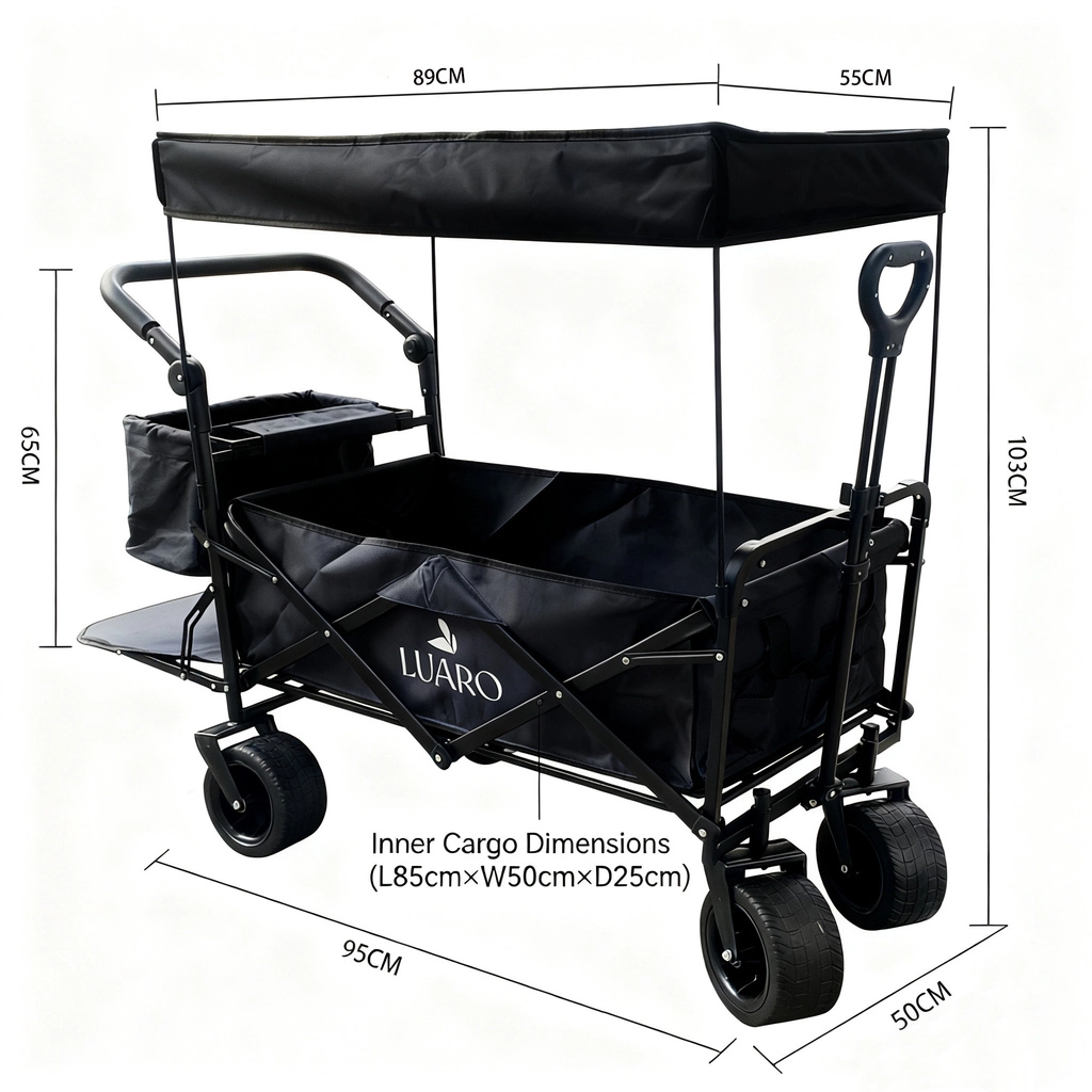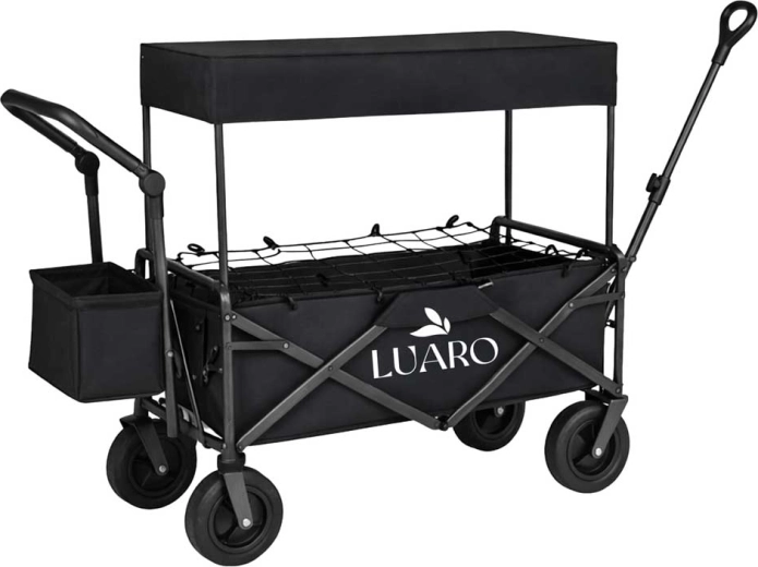 De LUARO-kar combineert mobiliteit, duurzaamheid en comfort in dagelijks gebruik. Hij is eenvoudig op te vouwen tot een compact formaat voor transport in de auto of opslag thuis. Brede “tank”-wielen kunnen overweg met zand, gazon en ruw terrein, terwijl zwenkende voorwielen en een vergrendelbare rem bij de trekstang voor zeker sturen zorgen.