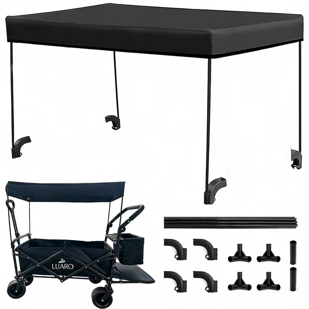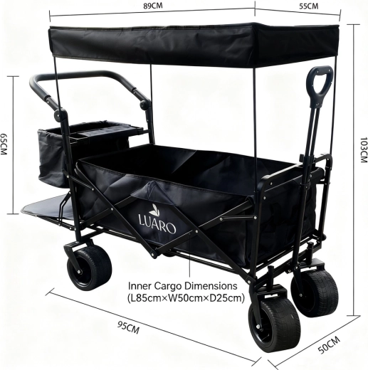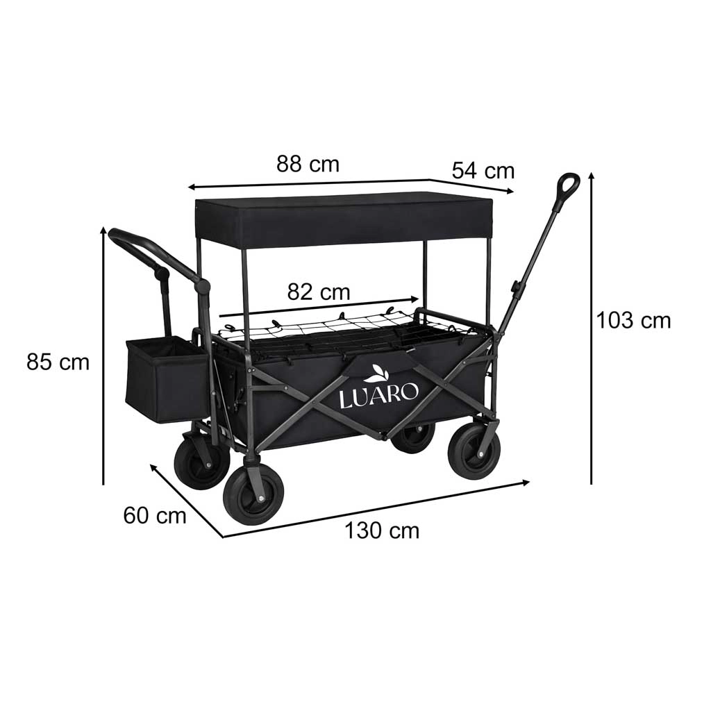 De praktische opvouwbare LUARO-kar met canopy is ideaal voor op het strand, kamperen en in de tuin. Hij biedt een grote inhoud, een stevige stalen constructie, brede terreinwielen en comfortabele bediening dankzij de telescoop-trekstang en de achterste duwbeugel. Inclusief afneembare beschermende canopy, net om de lading te zekeren en een extra zijtas voor betere organisatie.