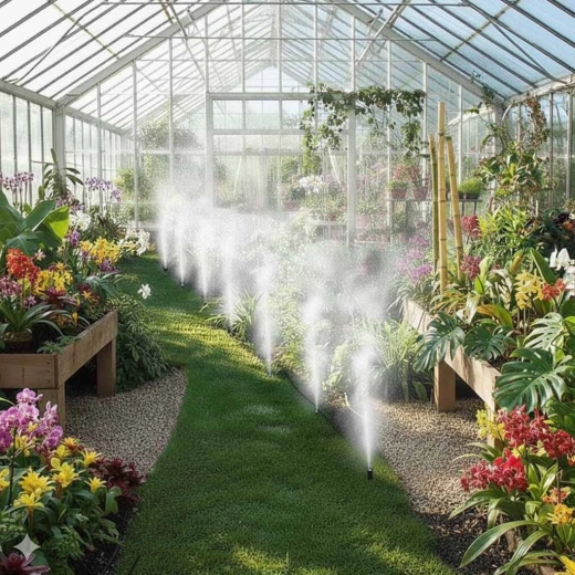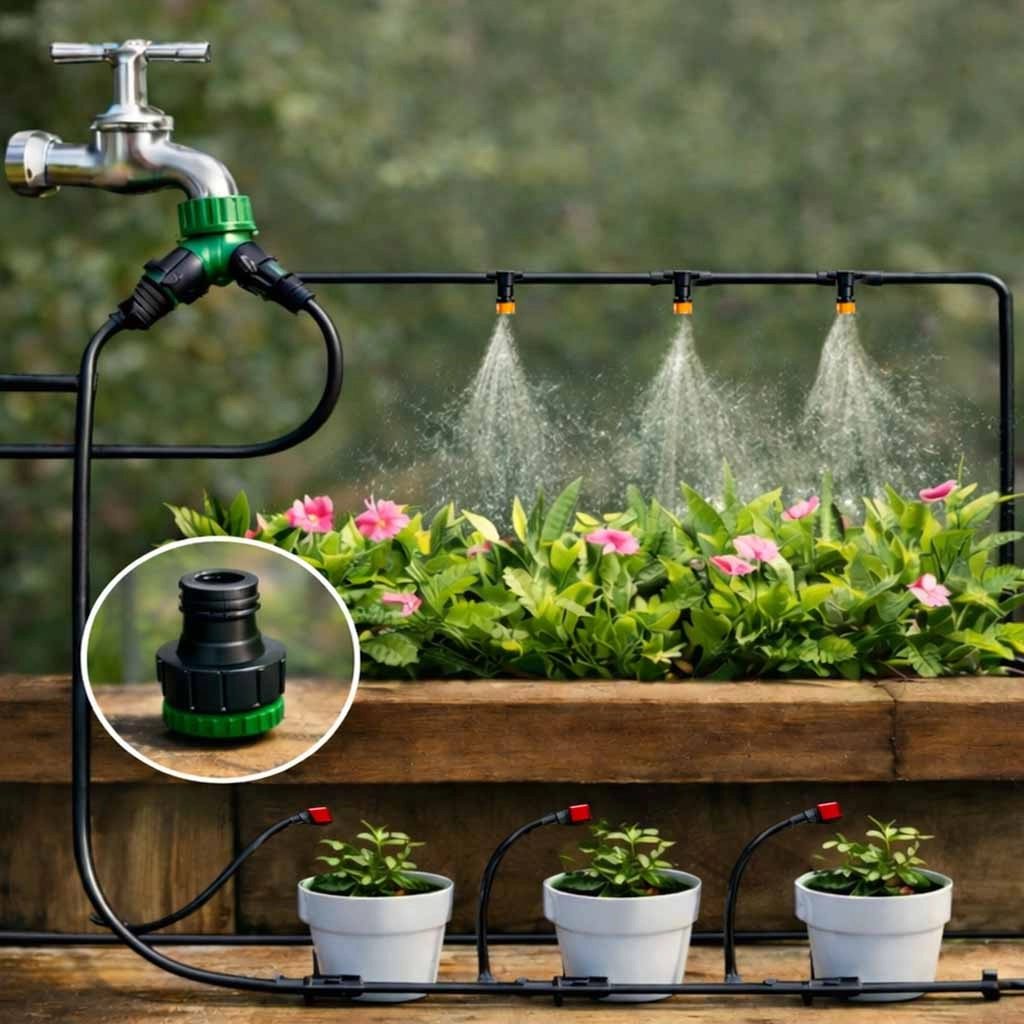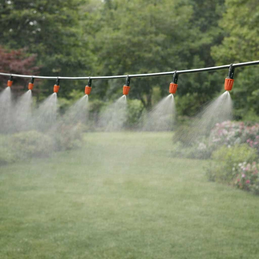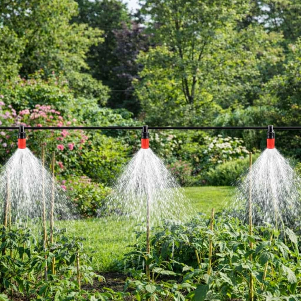 - Dubbele functie: fijne nevel voor koeling + druppelirrigatie voor waterbesparing