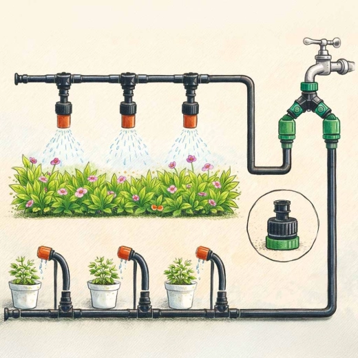 De Y-verdeler met afsluiters en snelkoppelingen laat toe twee takken op één bron aan te sluiten en de doorstroming per irrigatiezone afzonderlijk te regelen.