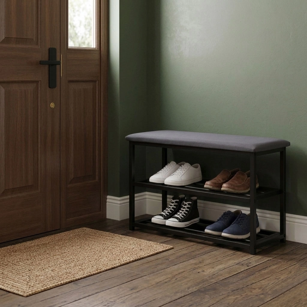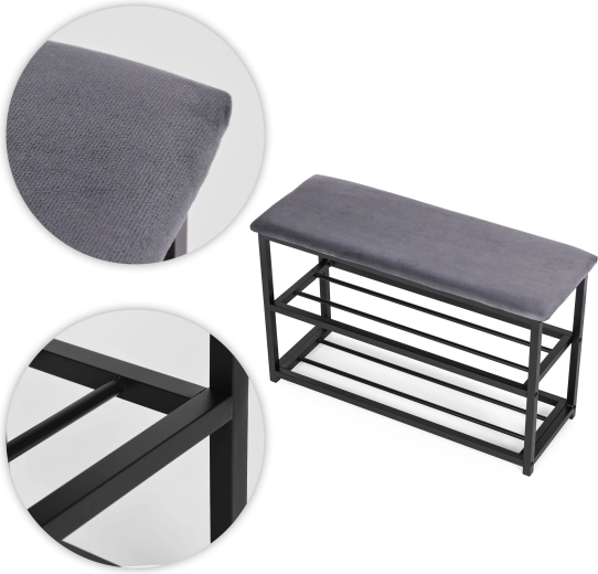 De zitting bestaat uit een MDF-plaat, een schuimlaag en een bekleding van fluwelen stof met een totale dikte van ca. 3 cm – prettig om aan te raken, elegant om te zien en comfortabel bij het aan- en uittrekken. Het open ontwerp van de planken zorgt voor snelle toegang en betere luchtcirculatie, waardoor schoenen sneller drogen en fris blijven.