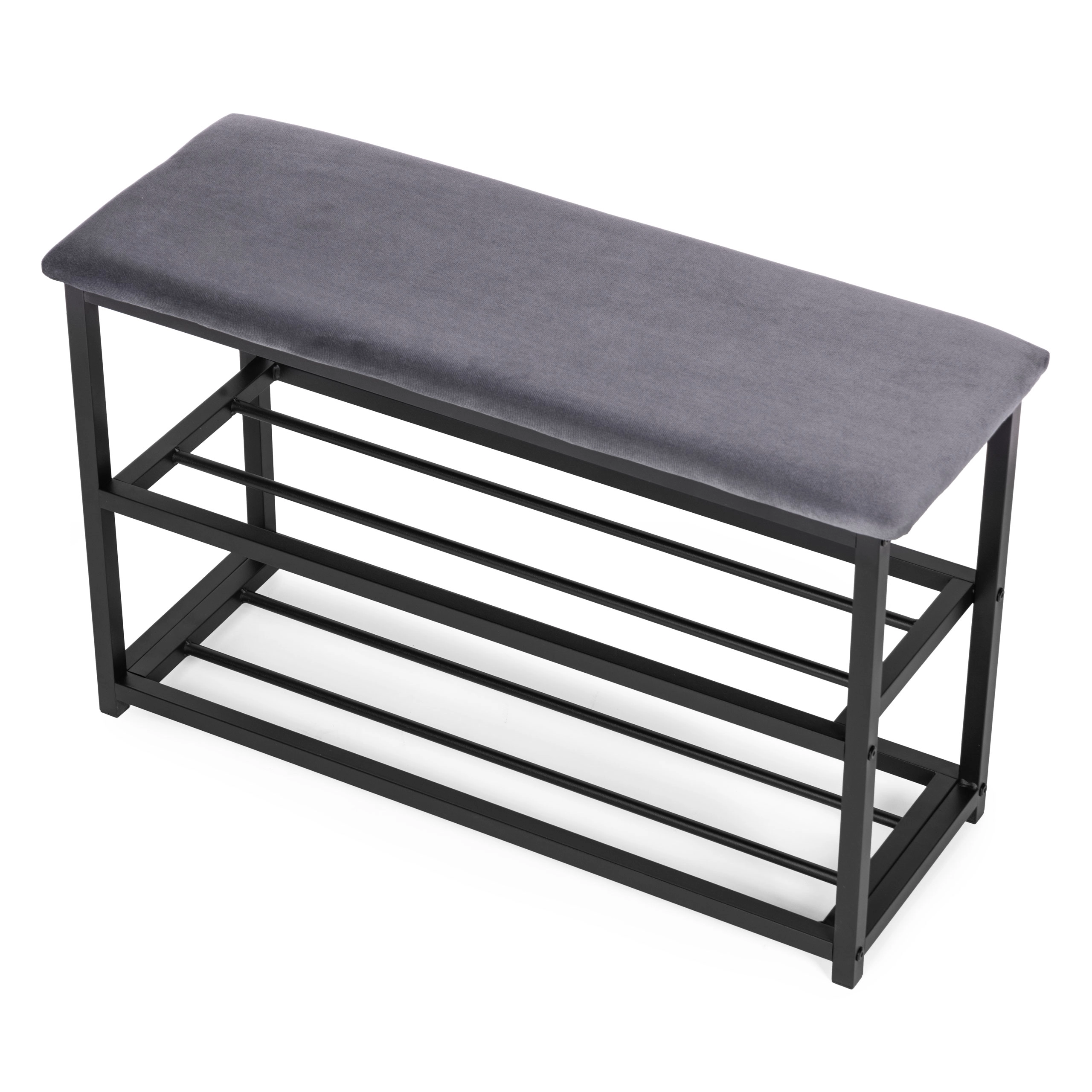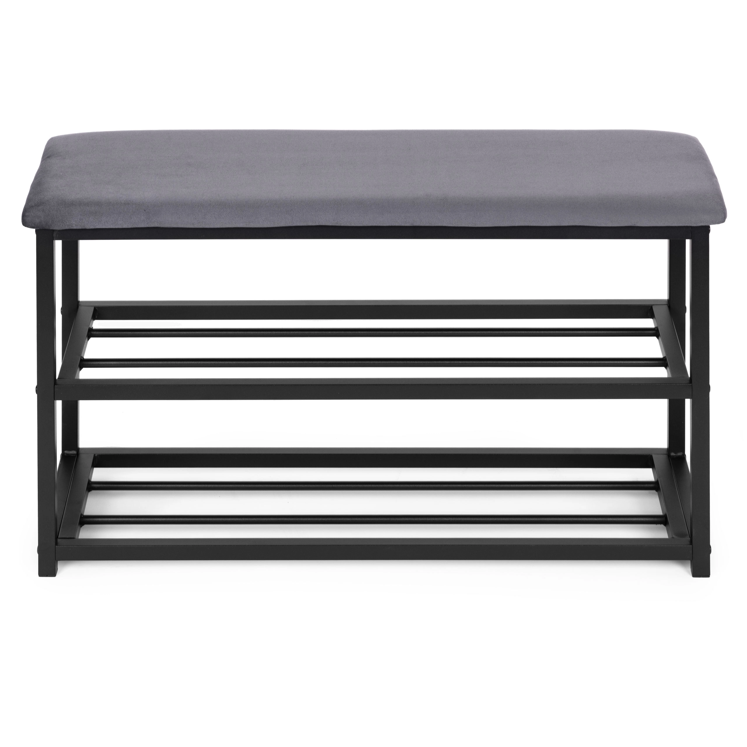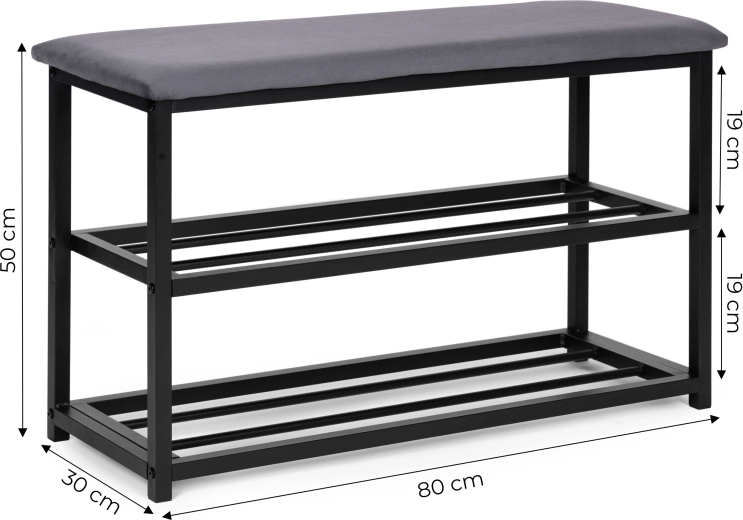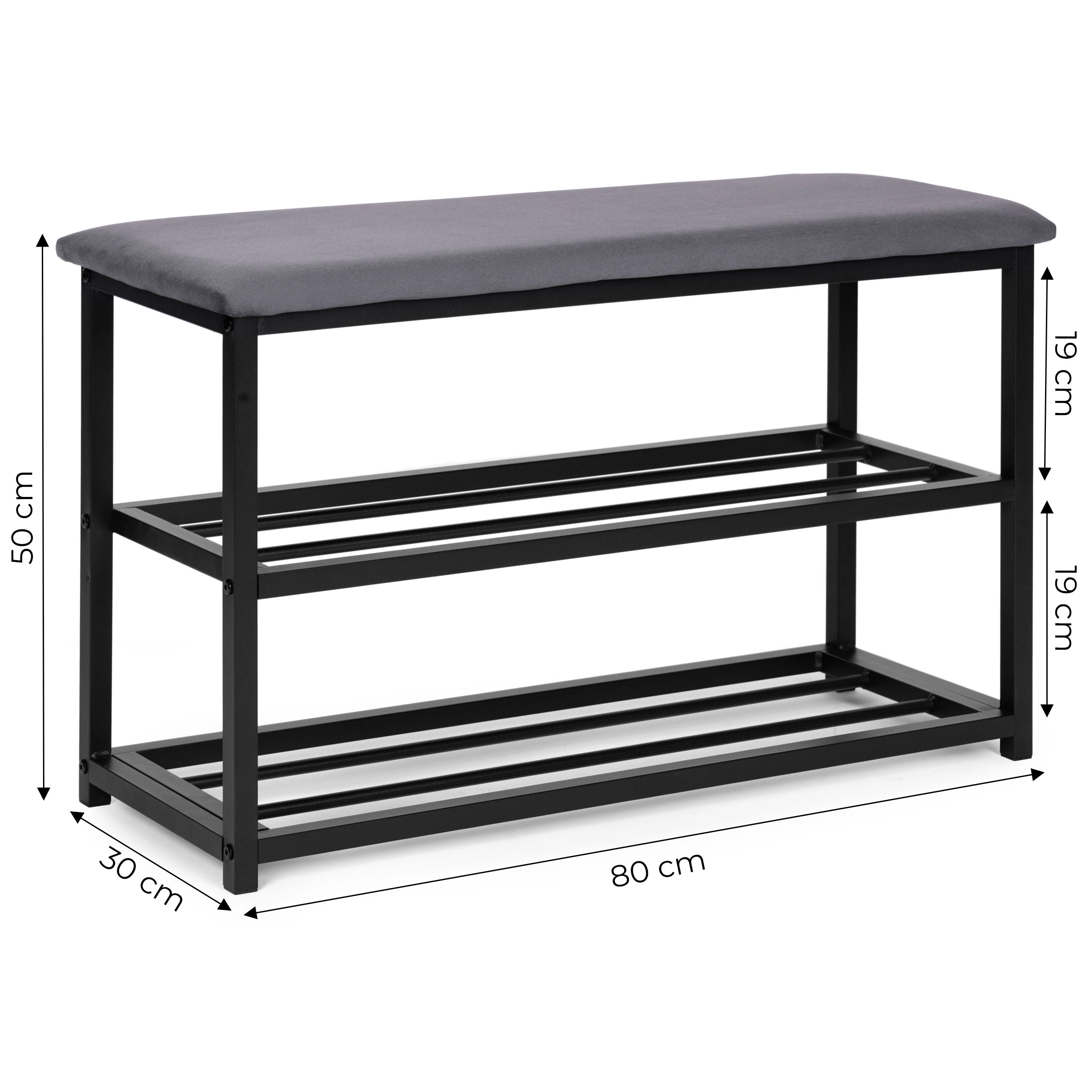 De stijlvolle schoenenbank van ModernHome combineert opbergruimte en comfortabel zitten in één. Dankzij twee planken biedt hij plaats aan tot 8 paar schoenen en de zachte fluwelen zitting maakt aan- en uittrekken makkelijker. Het poedergecoate stalen frame zorgt voor stabiliteit en een lange levensduur, terwijl de open planken overzicht en ventilatie van schoenen bieden. Ideaal voor de hal, kleedkamer en kledingkast.