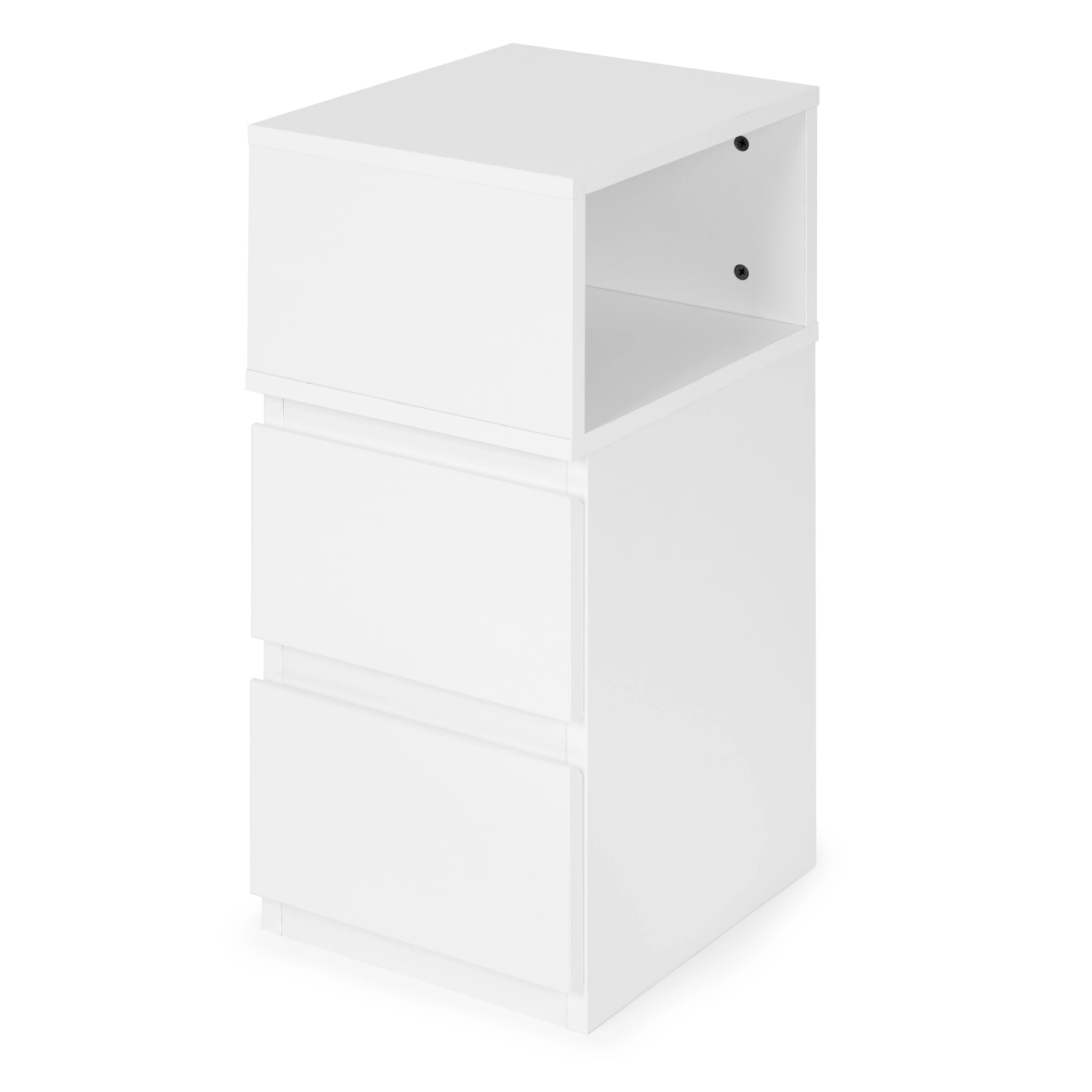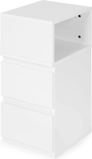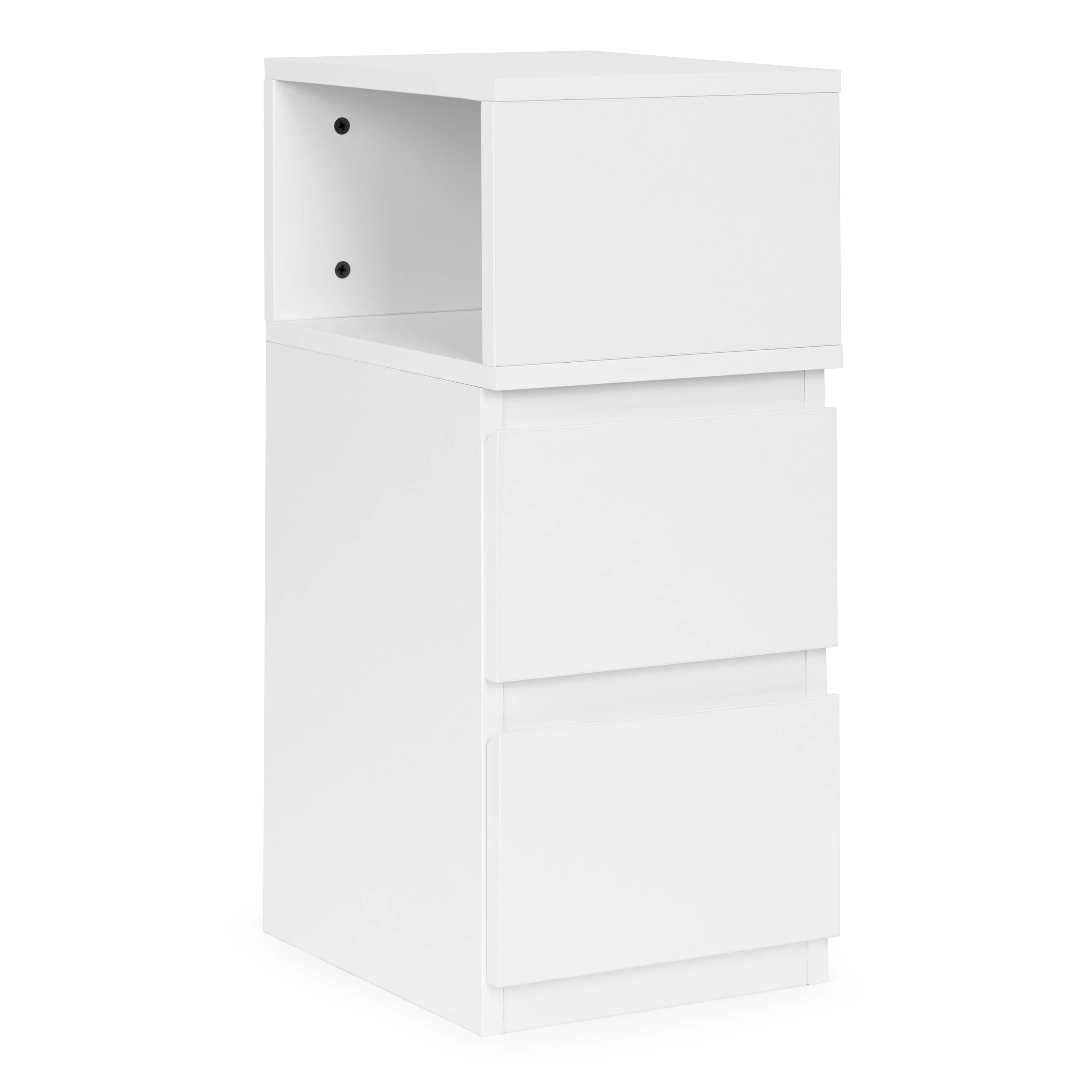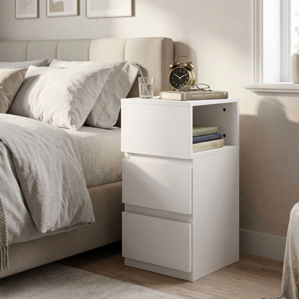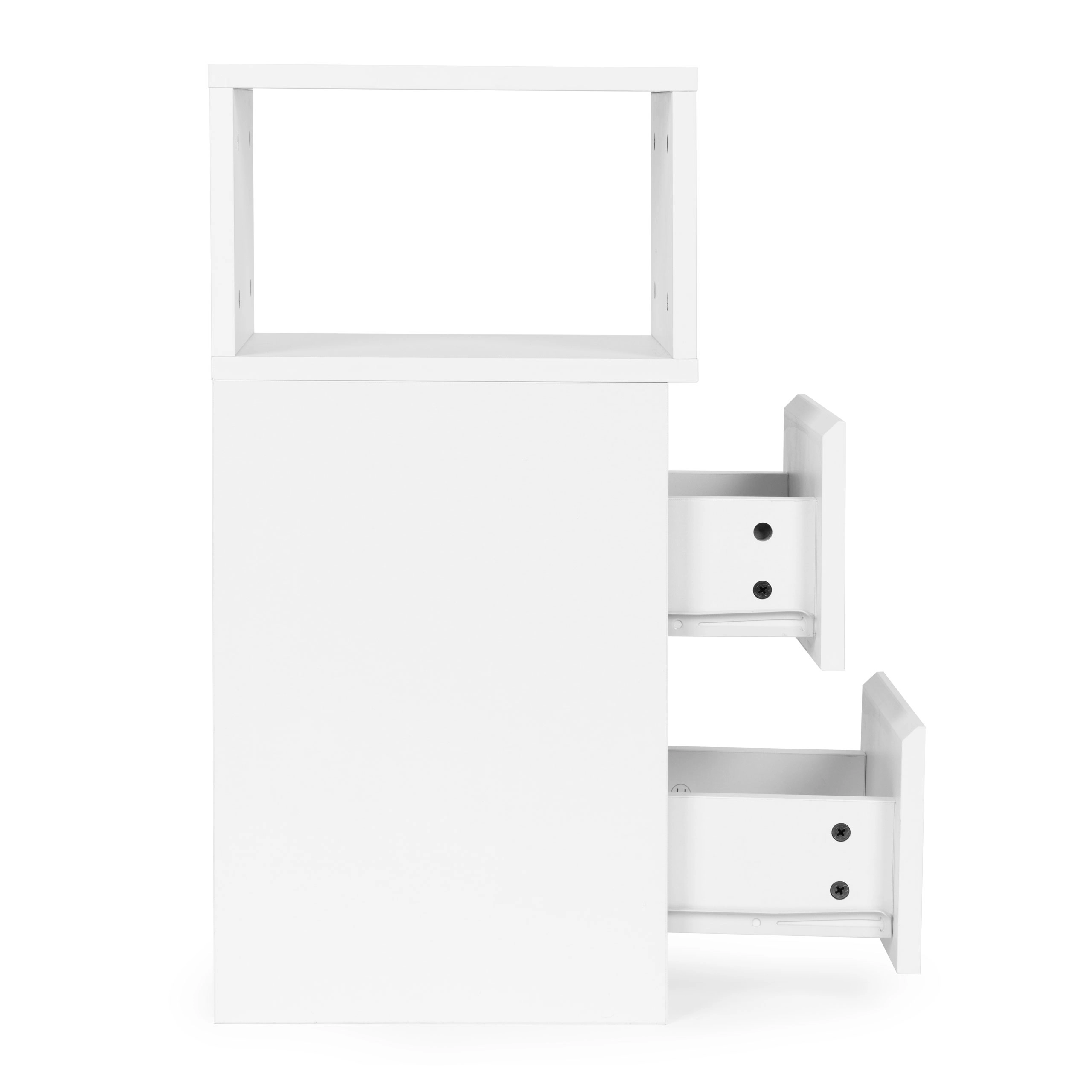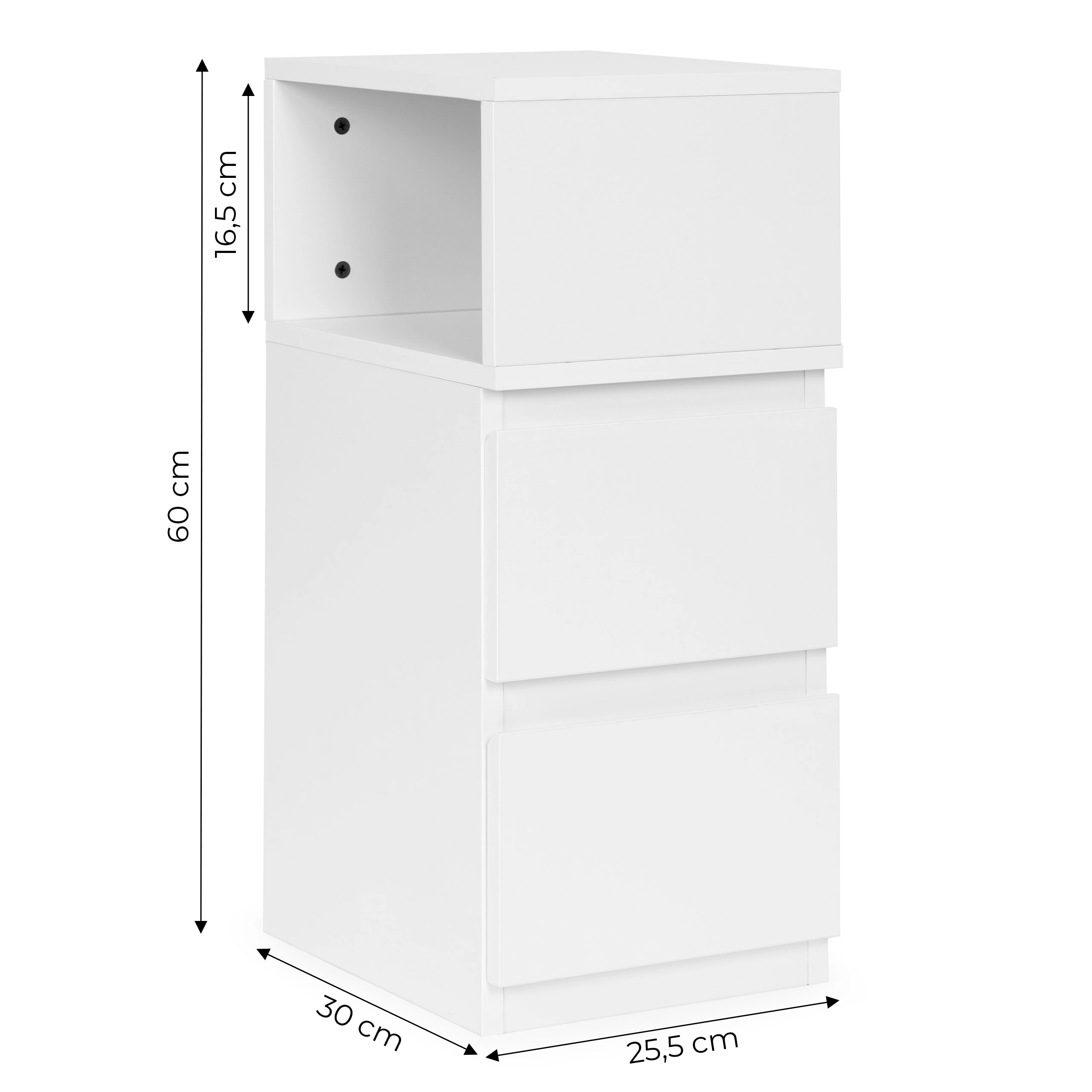 De doordachte opbergruimte omvat 2 ruime lades voor kleine spullen en een open plank voor wat je graag binnen handbereik hebt. Het kastje is gemaakt van duurzaam MDF, waardoor het stabiel en betrouwbaar is voor dagelijks gebruik. Het minimalistische, compacte design past moeiteloos in moderne en kleinere interieurs.