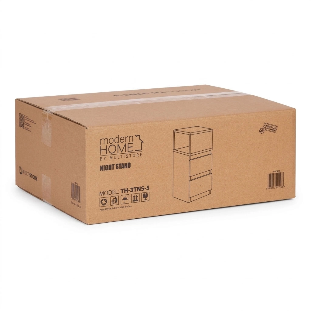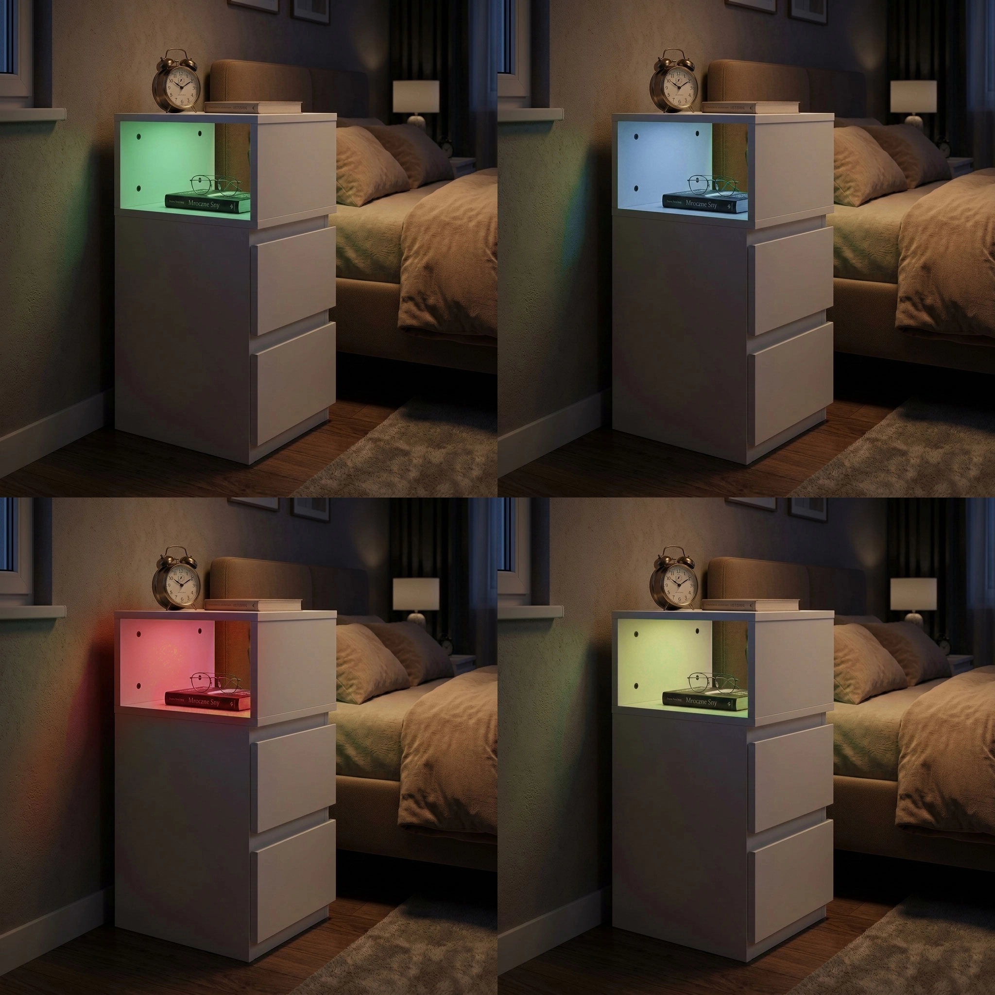 Creëer de juiste sfeer in de slaapkamer met het stijlvolle nachtkastje van ModernHome. De geïntegreerde RGB LED-verlichting in het open vak zorgt voor rust tijdens lezen en avondlijke ontspanning. De bediening is eenvoudig – met de afstandsbediening kies je uit 16 kleuren en effecten (Flash, Strobe, Fade, Smooth), terwijl de mobiele app een nog breder palet en traploze helderheidsinstelling biedt.