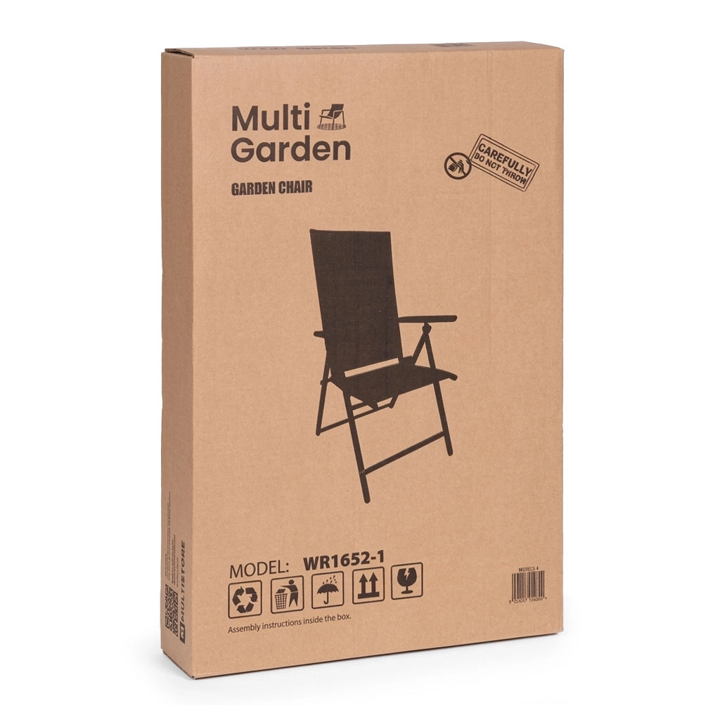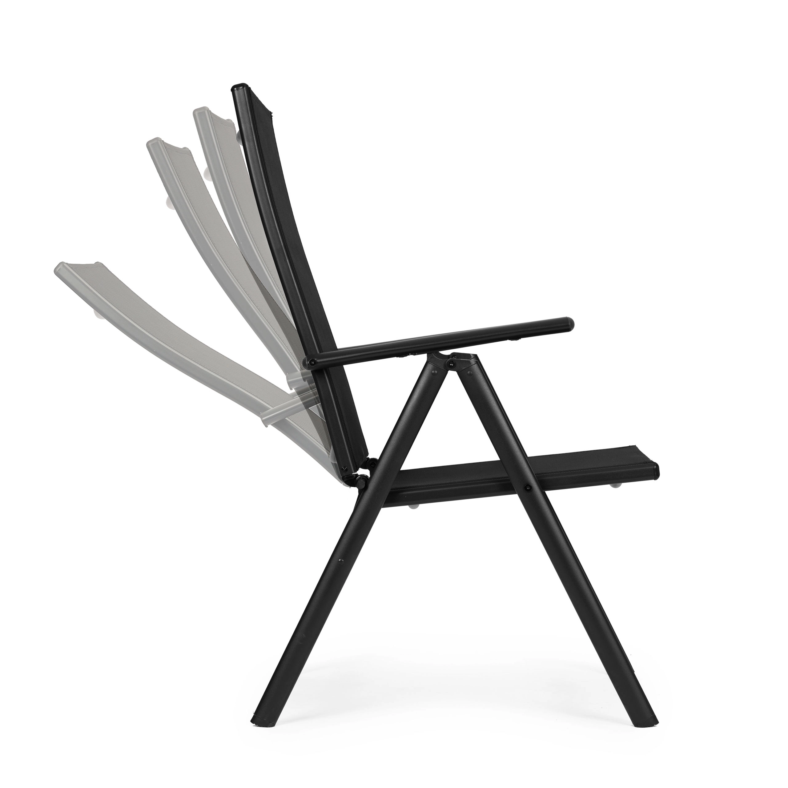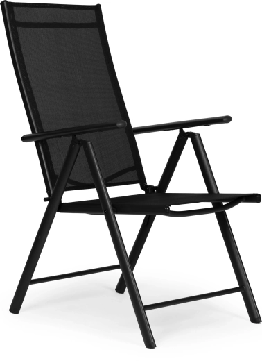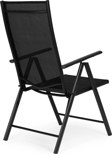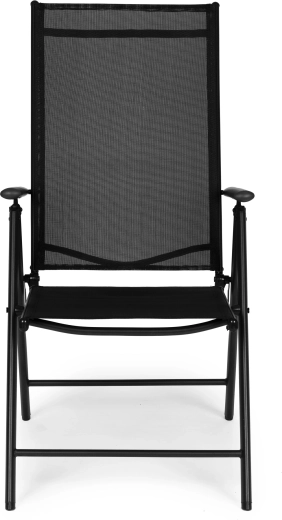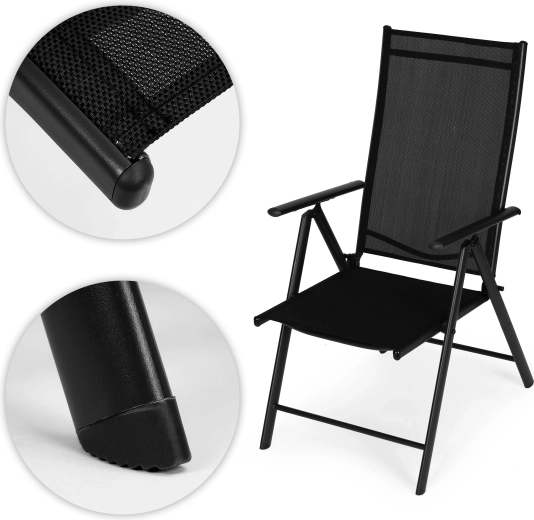 Dankzij de opvouwbare constructie bespaart de stoel ruimte en is hij klaar voor kamperen, picknick of vakantie. Beschermende pootdoppen minimaliseren het risico op krassen op vloer en terras. De moderne zwarte uitvoering past bij de meeste tuinsets en is onderhoudsvriendelijk.