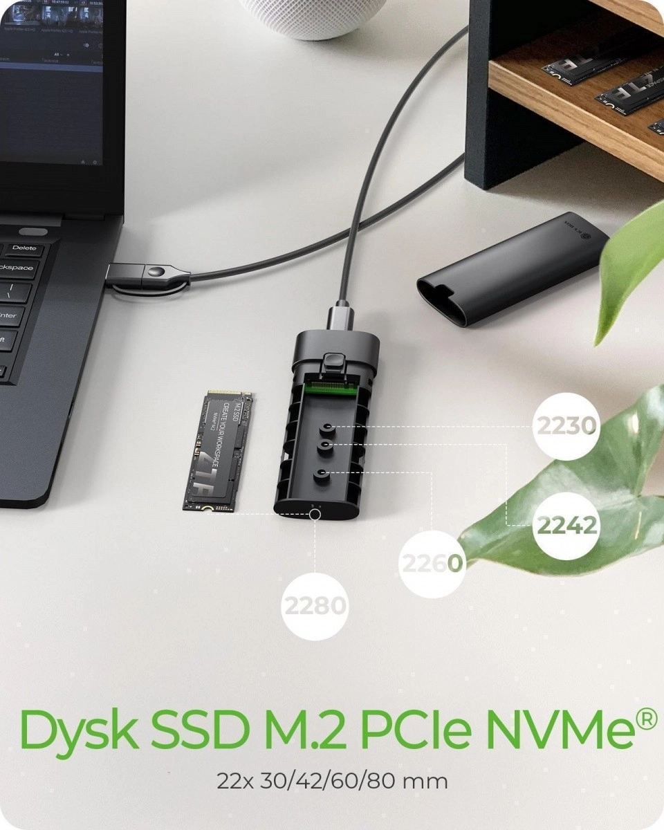 Compacte aluminium behuizing voor M.2 NVMe‑SSD met USB 3.2 Gen 2 Type‑C voor snelle gegevensoverdracht tot 10 Gb/s, gereedschapsloze installatie en brede compatibiliteit met 2230/2242/2260/2280 modules. De robuuste aluminium constructie fungeert als effectieve koelplaat en beschermt de schijf, terwijl Plug & Play directe inzetbaarheid op Windows, macOS en Linux biedt.