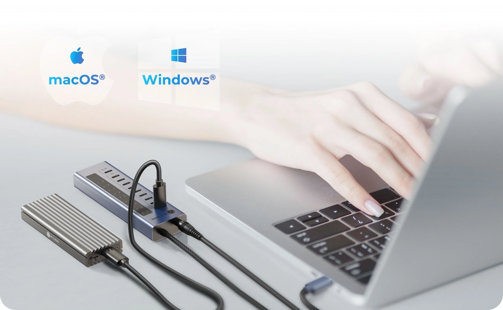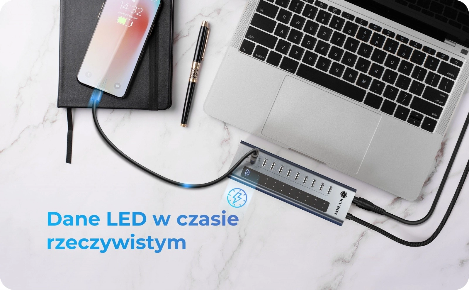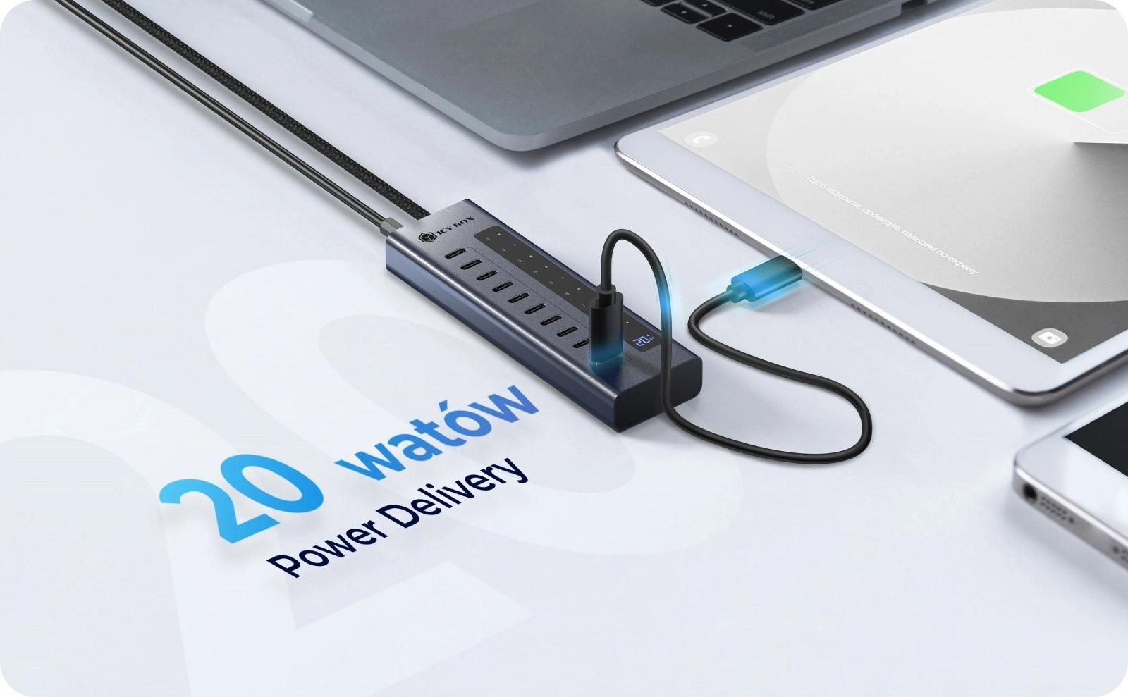 De unieke dedicated USB-C-poort met Power Delivery 20 W ondersteunt gelijktijdig 10 Gb/s data en snel opladen van je telefoon of tablet. Het geïntegreerde LED-display toont in real time het PD-uitgangsvermogen, zodat je in één oogopslag zicht hebt op het energieverbruik.