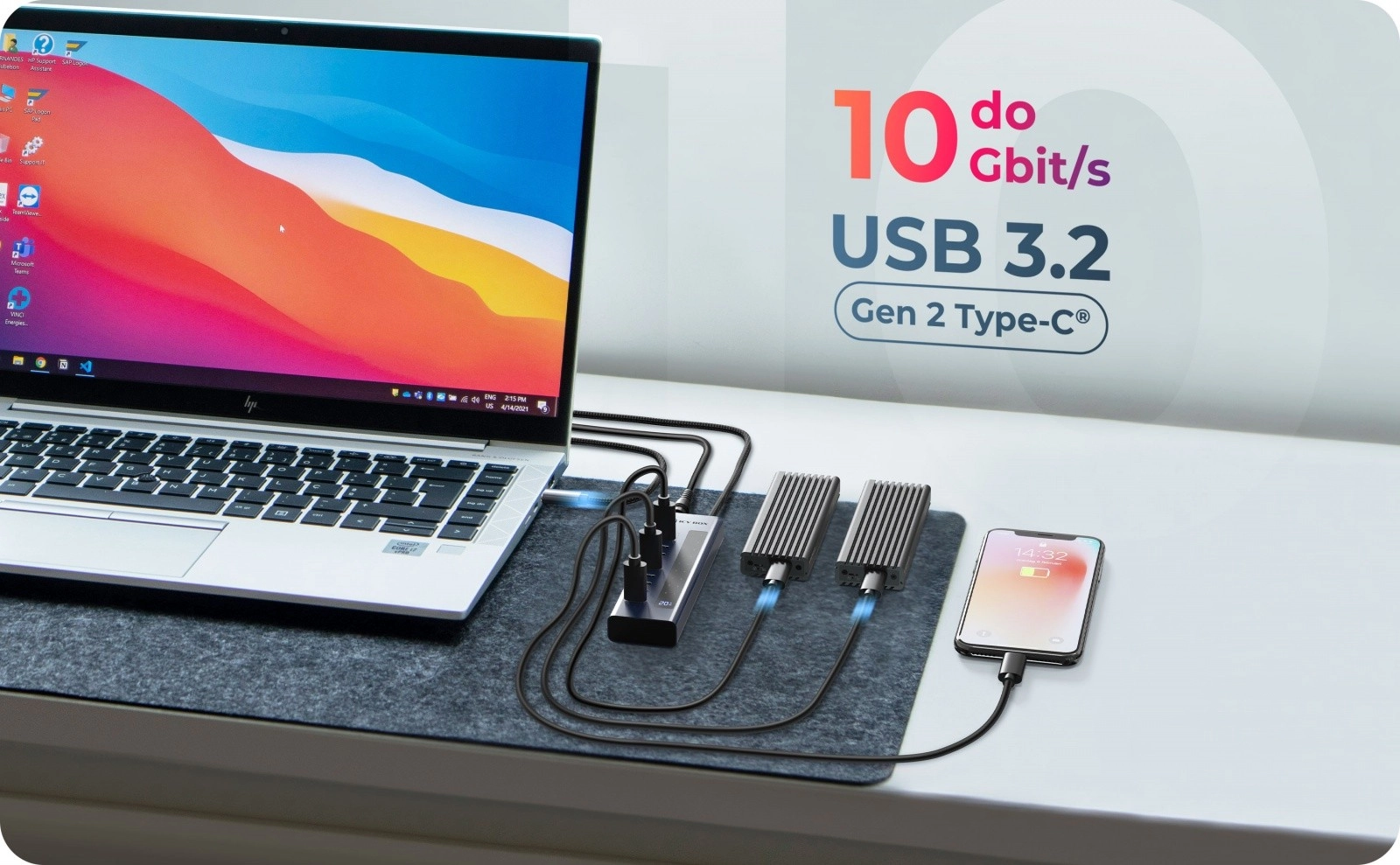 Breid de connectiviteit van je laptop of pc uit met een compacte en snelle USB-C-hub die overdrachten tot 10 Gb/s aankan. Sluit meerdere randapparaten tegelijk aan, maak back-ups van grote bestanden en behoud soepele productiviteit zonder wachten.