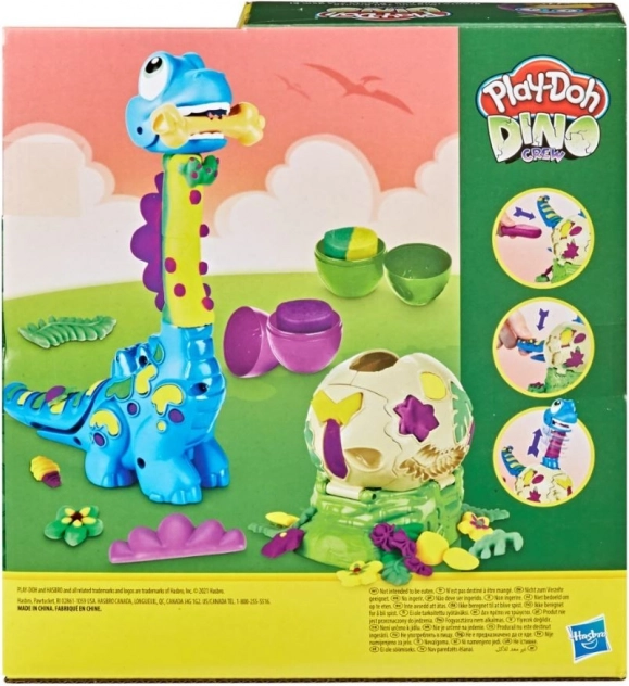 Help de kleine Bronto uit het ei te komen en kijk hoe zijn nek groeit! Vul gewoon de PLAY-DOH-figuur en druk op de staart – de nek schuift uit en het plezier kan beginnen. Met de vormpjes op de figuur en het ei maak je bladeren, bloemen, botten en een stijlvolle strik.