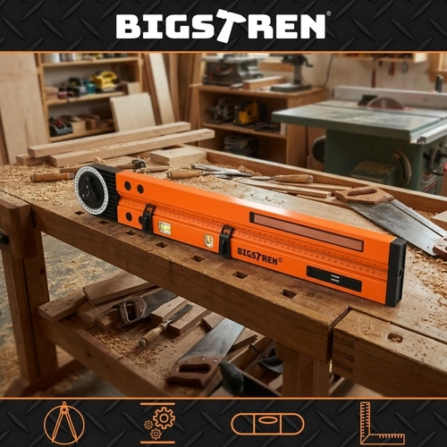 De geïntegreerde liniaal van 500 mm met goed leesbare metrische schaal bespaart tijd – u hoeft niet naar een extra meetlat te grijpen. De hoekvergrendeling houdt de instelling stabiel bij overdracht op het materiaal en het stevige lichaam van aluminiumlegering met ABS-elementen weerstaat intensief gebruik. De compacte constructie vervangt meerdere tools, zodat u ruimte bespaart in koffer en op de werkplek.