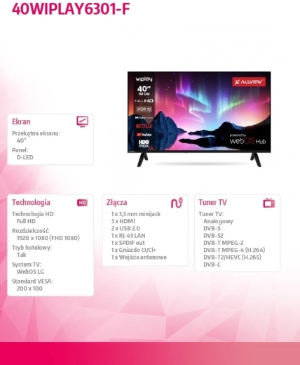 De ALLVIEW 40" LED‑tv combineert een elegant slank design met slimme functies van webOS. Je krijgt vloeiende weergave van online content, een overzichtelijk startscherm en snelle toegang tot de meest gebruikte apps met één druk op de knop. Dankzij de zuinige LED‑achtergrondverlichting is de tv efficiënt voor dagelijks kijken.