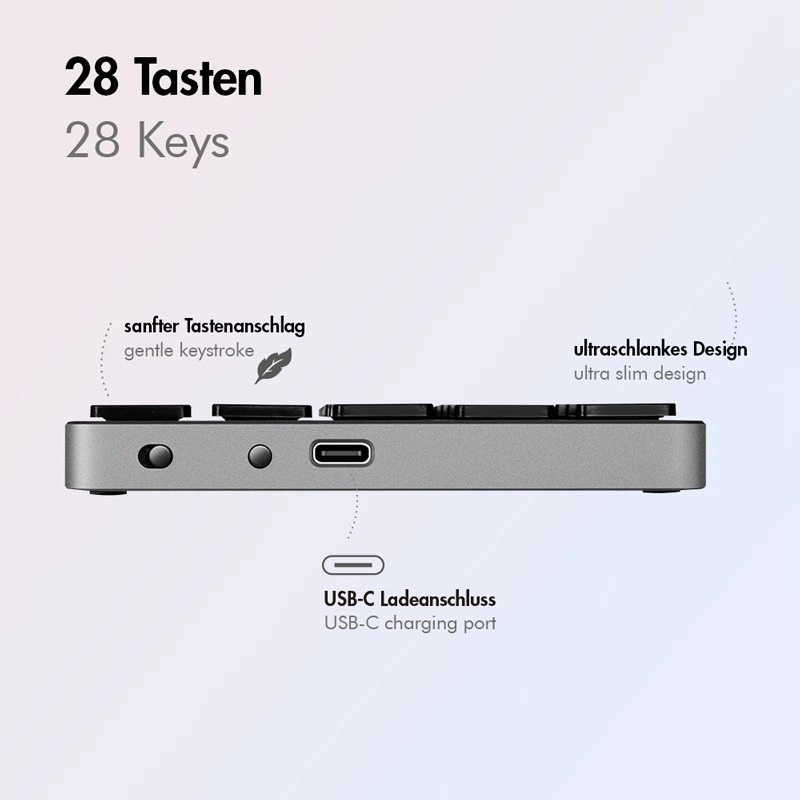 Stille schakelaarmechanismen bieden een zekere en comfortabele toetsaanslag met lage geluidsniveaus – ideaal voor op kantoor en onderweg. Functietoetsen zoals NumLock, ESC, Delete en een speciale Rekenmachine versnellen boekhouden, werken in Excel en Google Sheets en algemene data-entry.