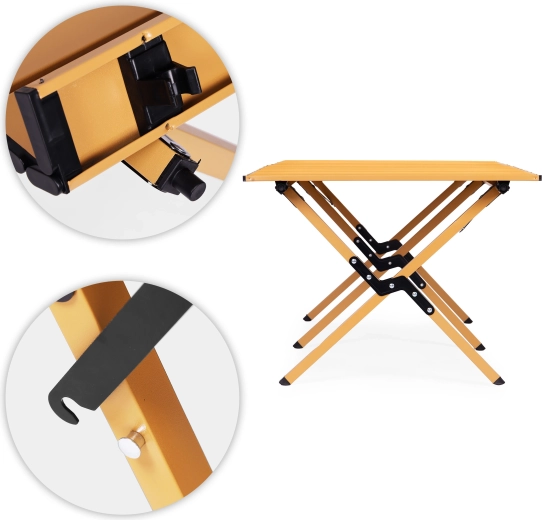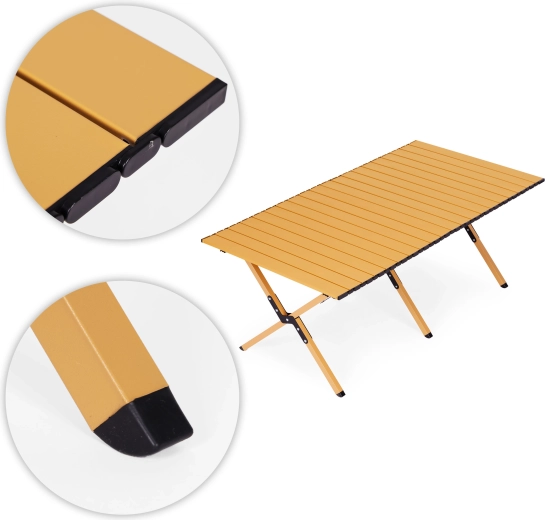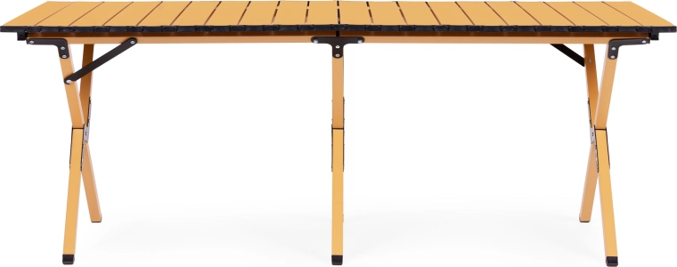 Geniet overal buiten van comfort – deze opvouwbare tafel biedt een stabiel oppervlak voor eten, drinken en kampeeraccessoires. Dankzij het robuste frame van koolstofstaal en het oprolbare lamellenblad biedt hij uitstekende stabiliteit, eenvoudig onderhoud en snel opzetten.