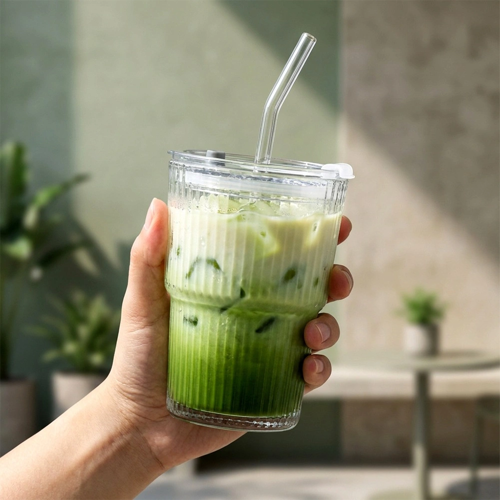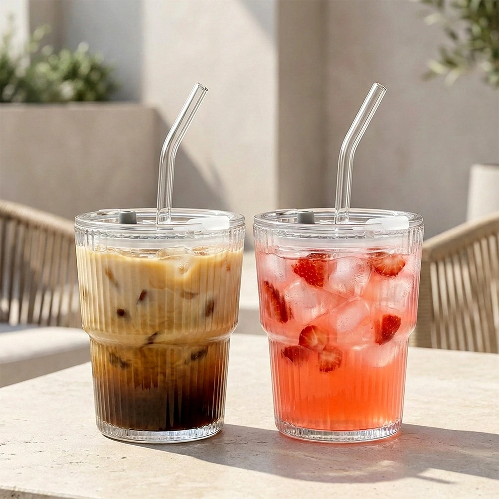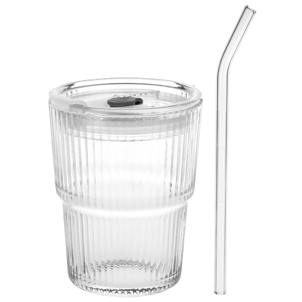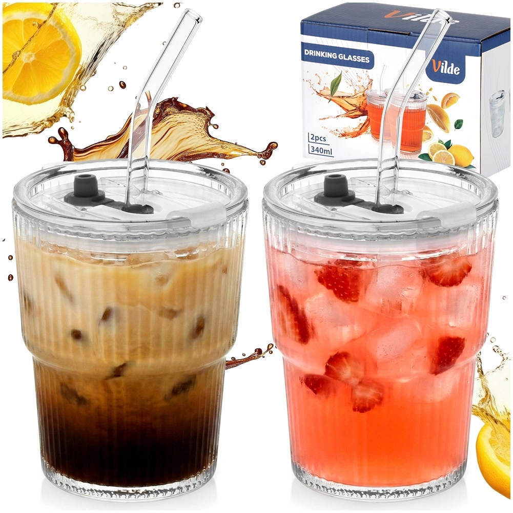 Stijlvolle set van 2 glazen tumblers van 340 ml met een deksel met siliconen afdichting en een herbruikbaar rietje. Het geribbelde glas ligt beter in de hand en de transparante uitvoering benadrukt de kleur van de drank. Ideaal voor ijsthee, ijskoffie, limonades en sappen thuis, op het werk en op het terras. Eenvoudig te onderhouden – geschikt voor in de vaatwasser.