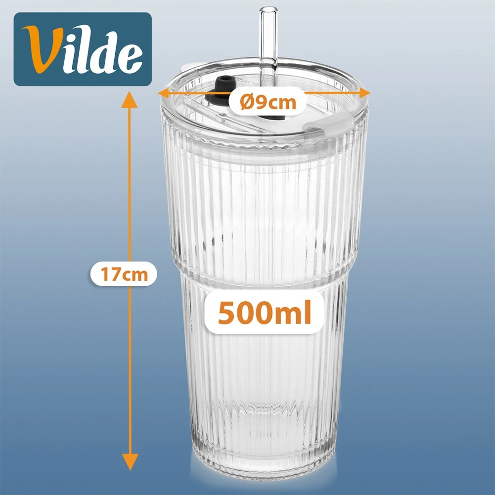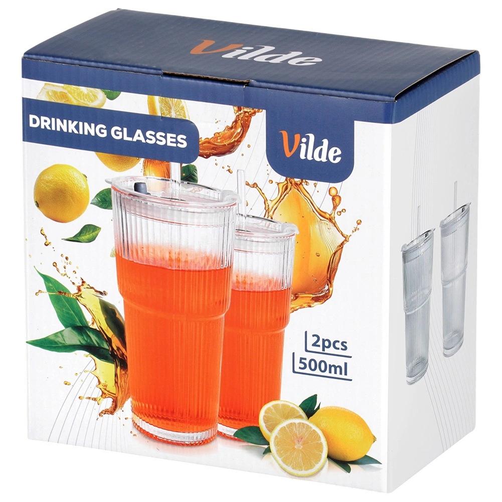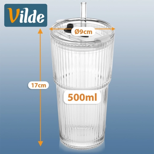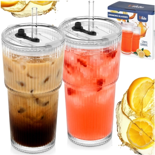 Elegante set van twee glazen tumblers met een inhoud van 500 ml, voorzien van een afdichtend deksel en een herbruikbaar rietje. Het geribbelde glas zorgt voor een stevige grip, het deksel met opening minimaliseert morsen en dankzij het universele ontwerp zijn ze perfect voor koude én warme dranken. Vaatwasmachinebestendig. Beproefde kwaliteit van Vilde.