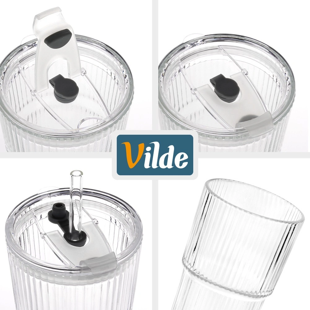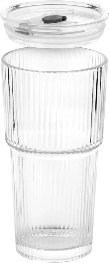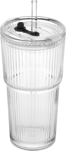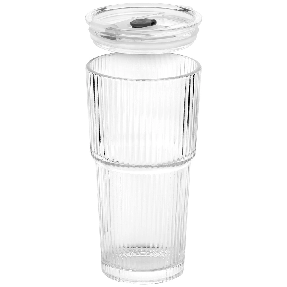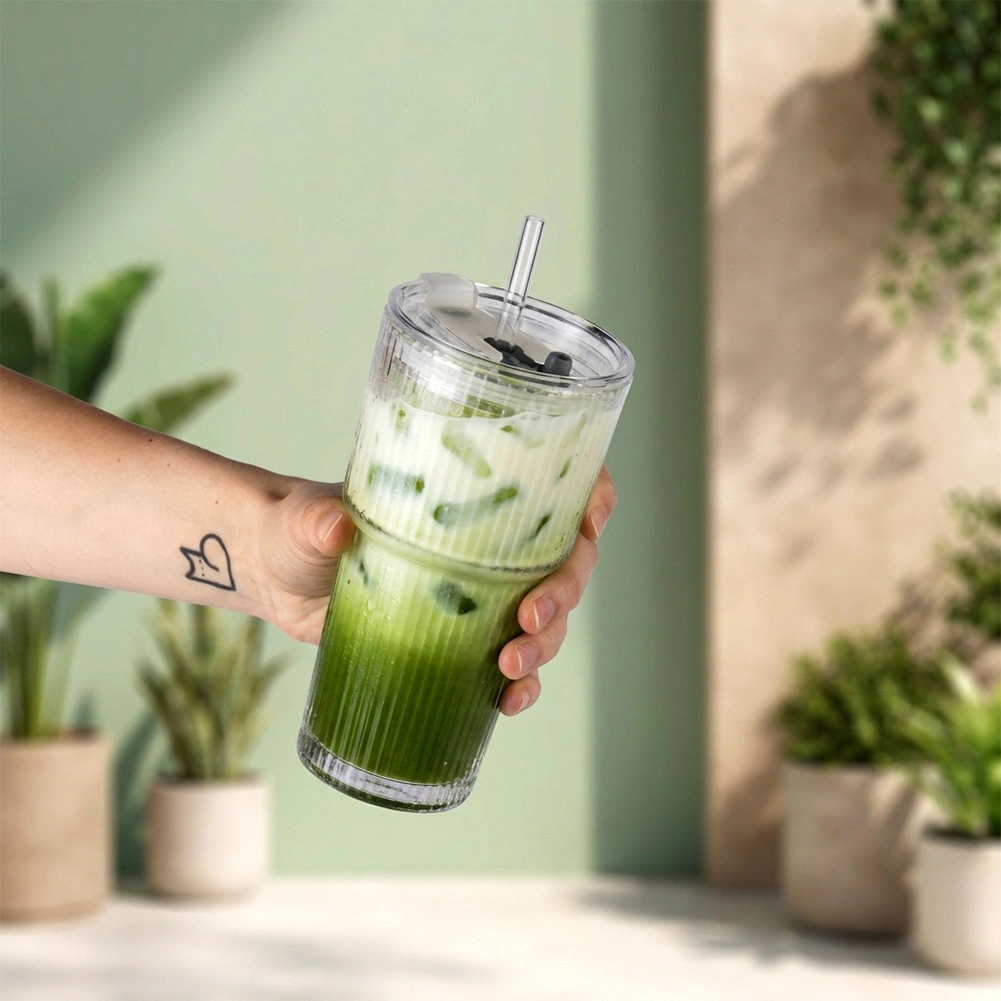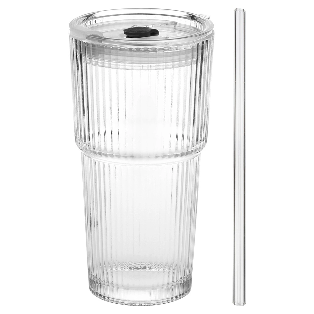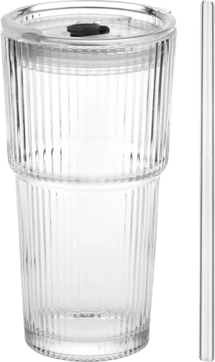 Stijlvolle glazen bekers met verticale ribbeling combineren functionaliteit met een minimalistische look. Het transparante glas laat je limonades, iced coffee en thee schitteren, terwijl het deksel met afdichting en rietjesopening helpt ongewenst opspatten te beperken bij het dragen in verticale positie.