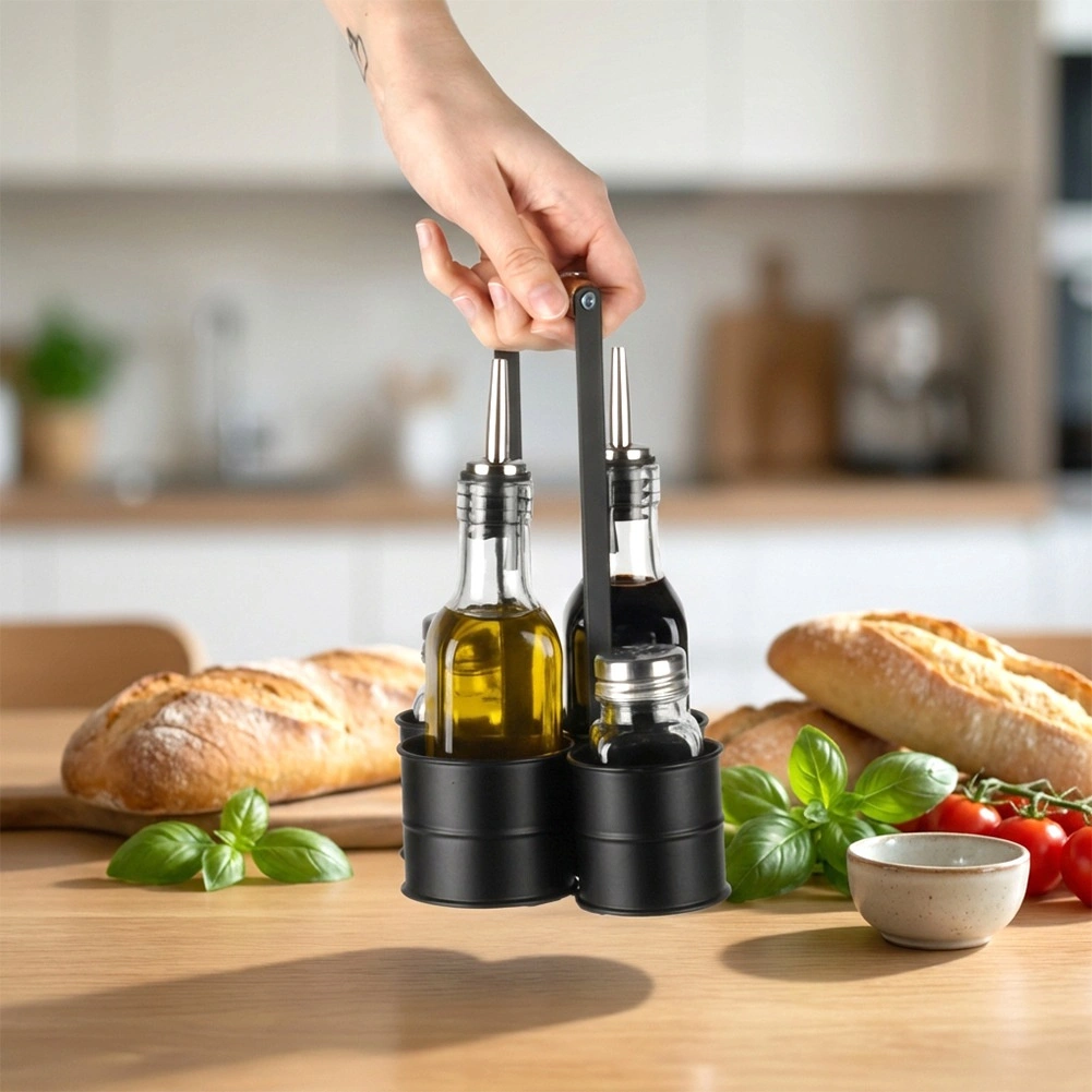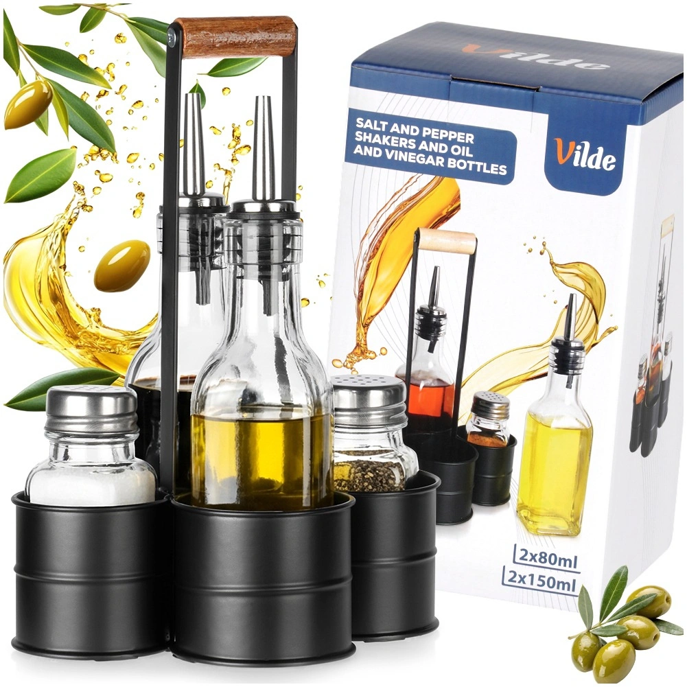 Deze designset combineert functionaliteit en esthetiek: twee flessen van 150 ml (4,5 × 4,5 × 20 cm) voor olie en azijn met roestvrijstalen schenkmonden voor vloeiend en schoon serveren, aangevuld met een zout- en peperstrooier van 80 ml (4 × 4 × 9,5 cm). Alles is opgeborgen in een stevige metalen houder (16,5 × 13,5 × 23 cm) met een houten greep voor eenvoudig transport.