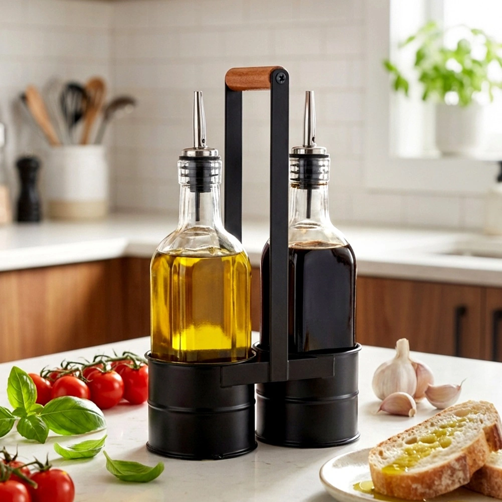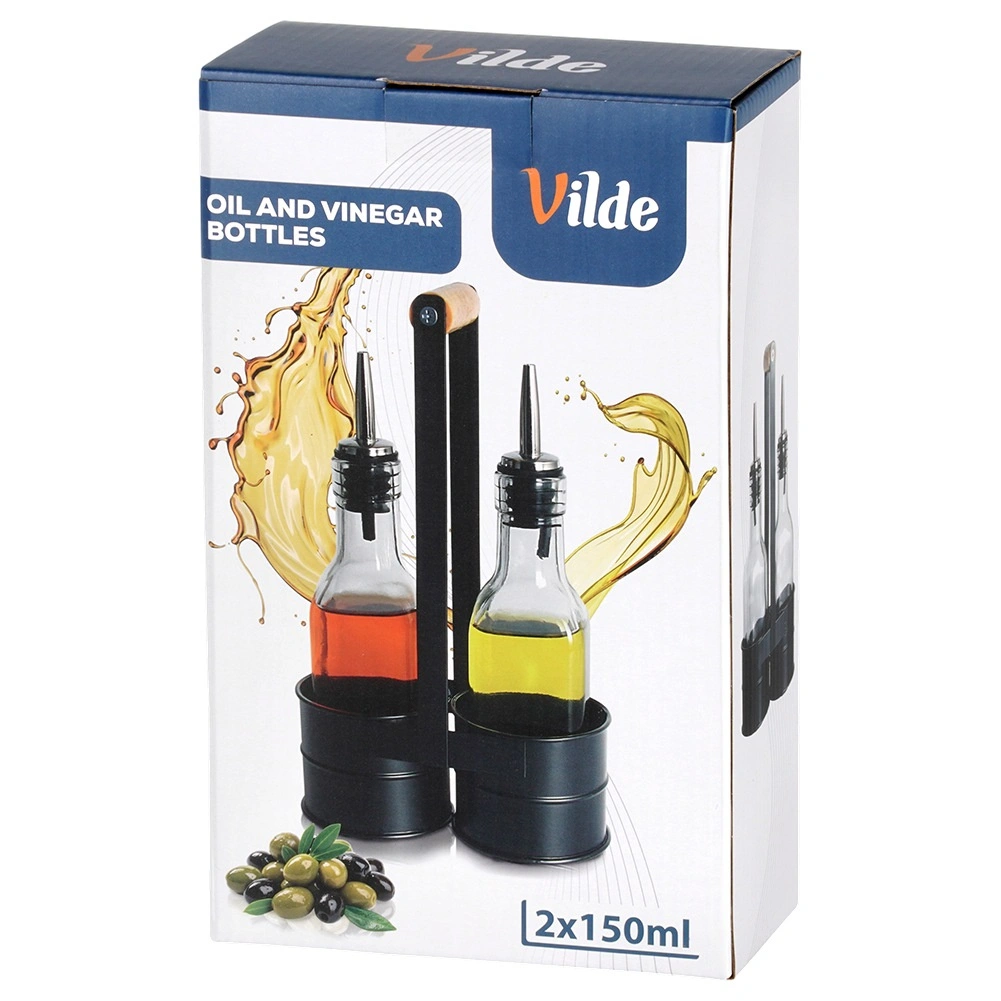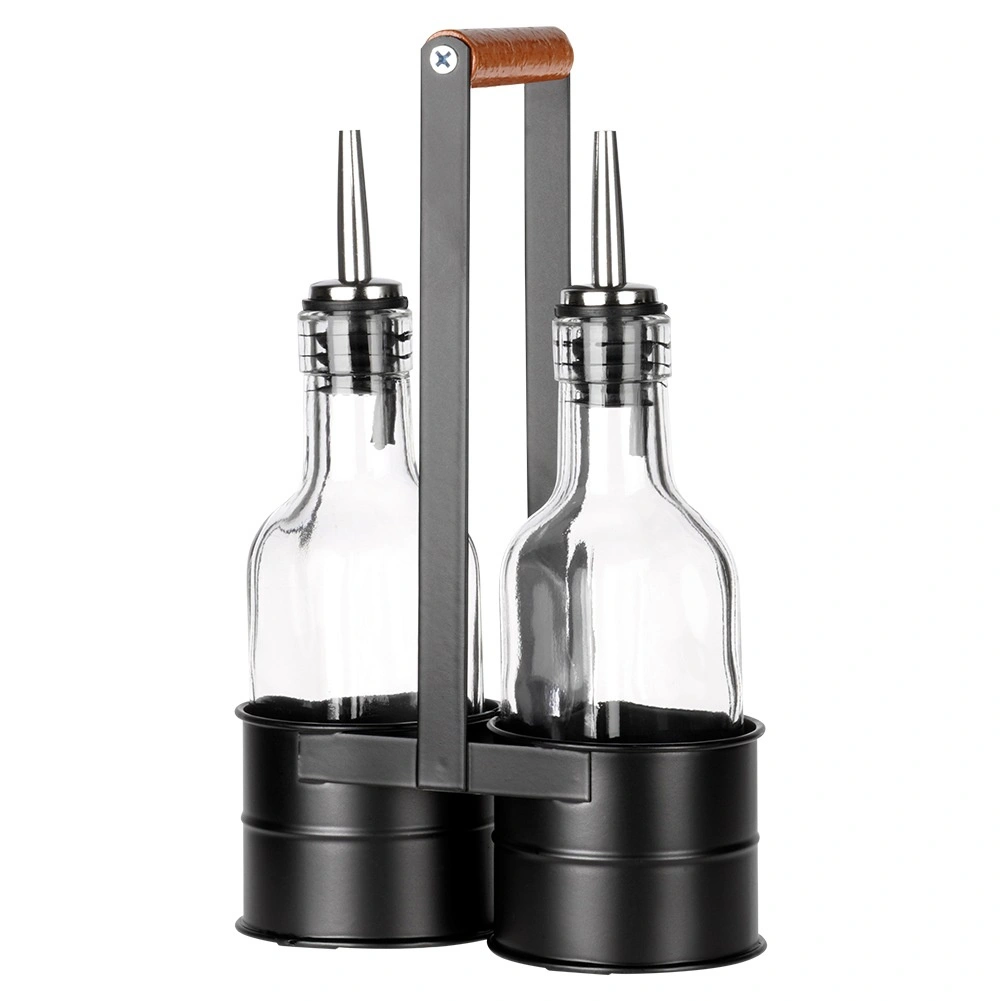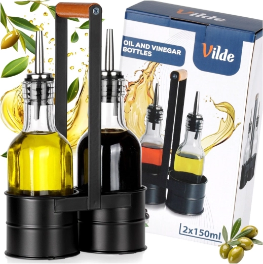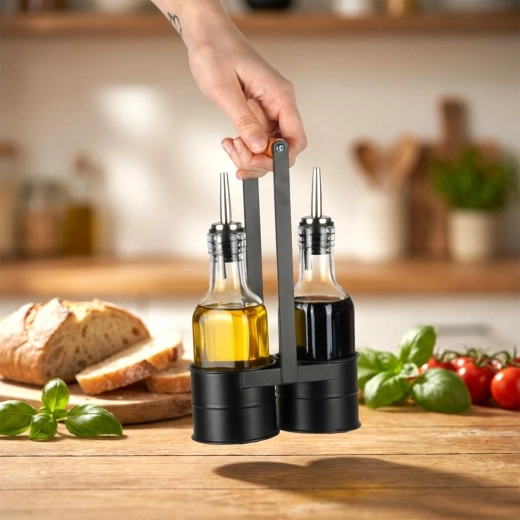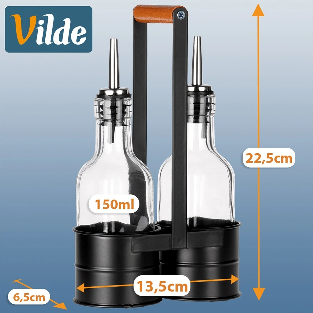 Deze designset van 2 flessen van helder glas is ideaal voor het bewaren en serveren van olijfolie en azijn. Het metalen rek in zwart met een comfortabele houten greep houdt de flessen veilig bij elkaar en maakt verplaatsen in de keuken en aan de eettafel eenvoudiger. De roestvrijstalen schenktuiten vertragen de doorstroming en minimaliseren druppelen, waardoor gecontroleerd en probleemloos schenken mogelijk is.