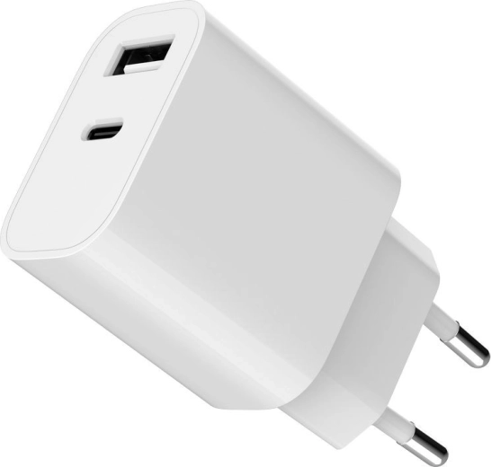 Compacte universele stopcontactlader met twee uitgangen USB‑A en USB‑C voor het gelijktijdig en gemakkelijk opladen van twee apparaten. Levert 5 V / 2,4 A totaal vermogen, ideaal voor smartphones, tablets en accessoires, en dankzij de EU‑stekker eenvoudig aan te sluiten op een standaard stopcontact.