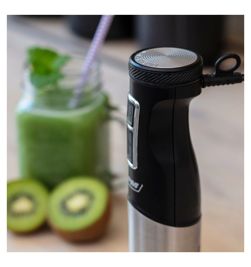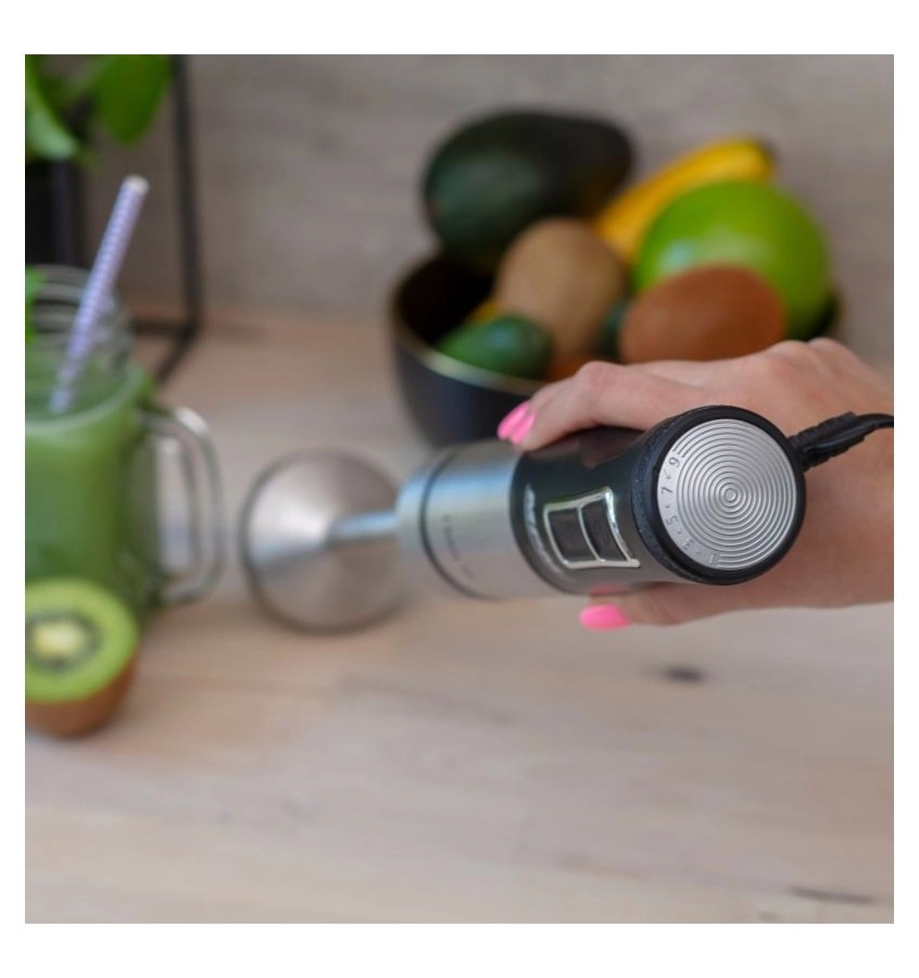 Krachtige staafmixer met een motor van 1500 W voor zijdezachte soepen, romige smoothies en het hakken van ingrediënten in een handomdraai. Biedt 9 snelheidsstanden en een Turbo-functie voor snelle resultaten. De afneembare roestvrijstalen voet is duurzaam en geschikt voor gebruik bij hoge temperaturen, zodat je direct in de pan kunt mixen na het koken. De ergonomische handgreep en de beschermkap van het mes beperken spatten en zorgen elke dag voor comfortabel gebruik.
