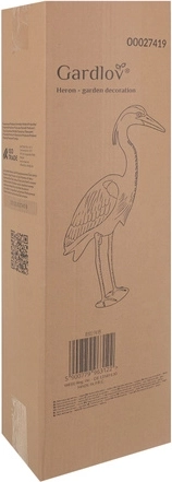 Inhoud van de set: reigerfiguur, basis met poten, grondpin, meertalige handleiding, originele doos van de fabrikant.