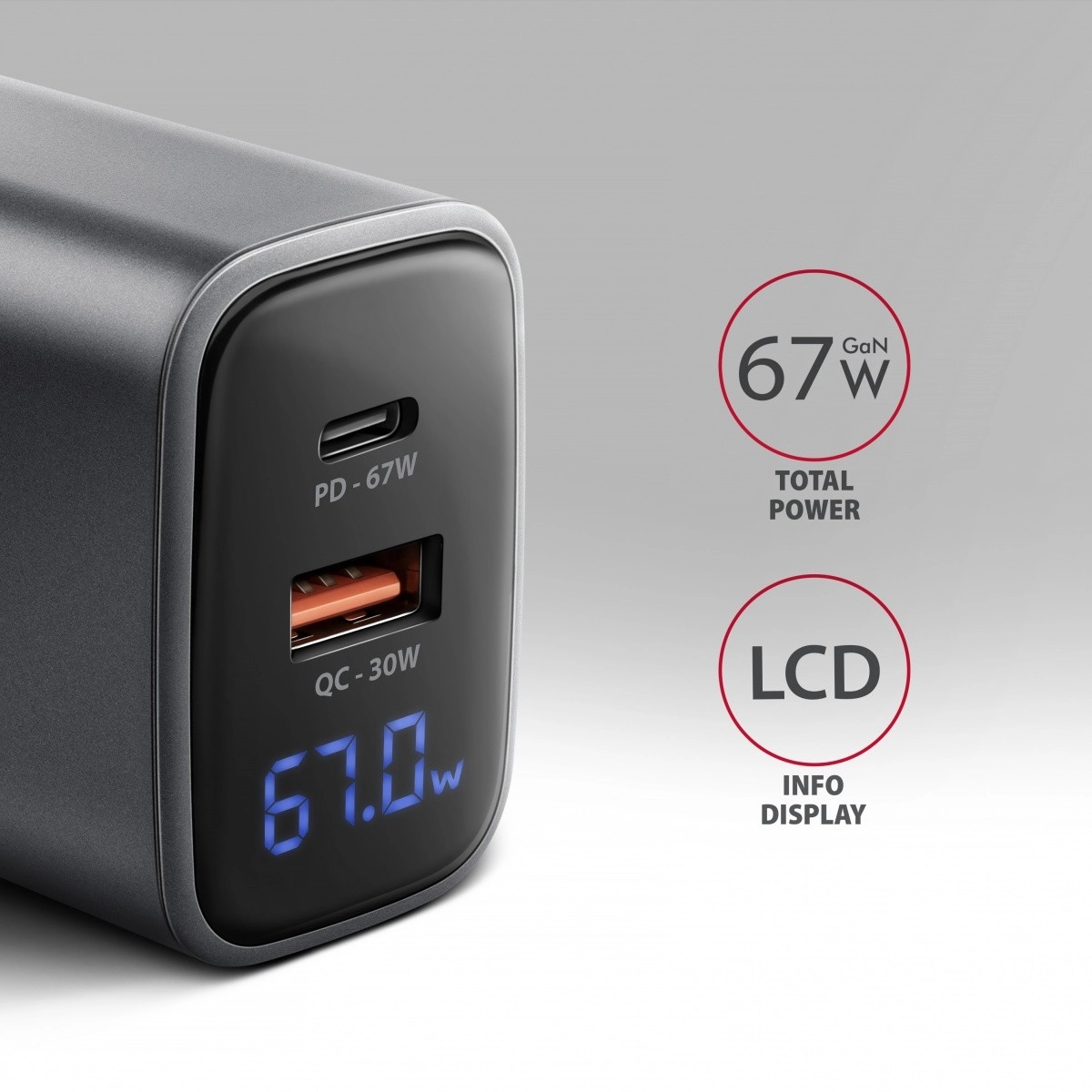 De universele lader met geavanceerde GaN-technologie levert hoog vermogen in een klein formaat. De USB‑C PD 3.0-poort (tot 67 W) is ideaal voor moderne laptops, tablets en telefoons; de USB‑A QC 3.0‑poort (tot 30 W) voor snel opladen van smartphones. Bij gelijktijdig gebruik van beide poorten verdeelt de lader het vermogen slim en blijft het laden stabiel en veilig.