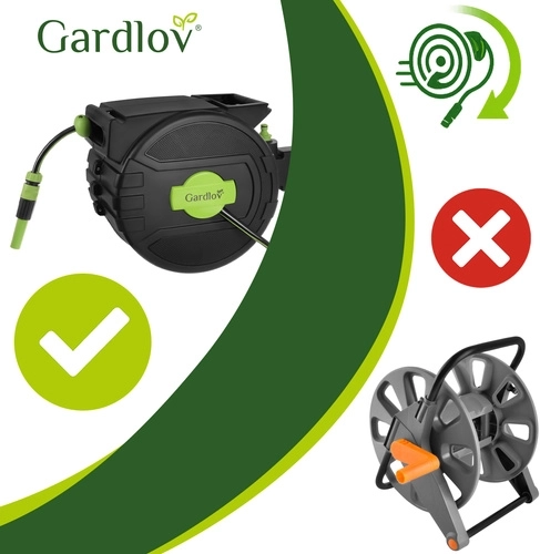 De GARDLOV-haspel houdt je tuin en technische ruimte perfect opgeruimd. Na gebruik wordt de slang automatisch en gelijkmatig opgerold in de robuuste behuizing, terwijl het vergrendelmechanisme de slang tijdens het sproeien op de ideale lengte vastzet. De 180° draaibare beugel maakt vrije beweging rond de perken mogelijk zonder dat de slang knikt.
