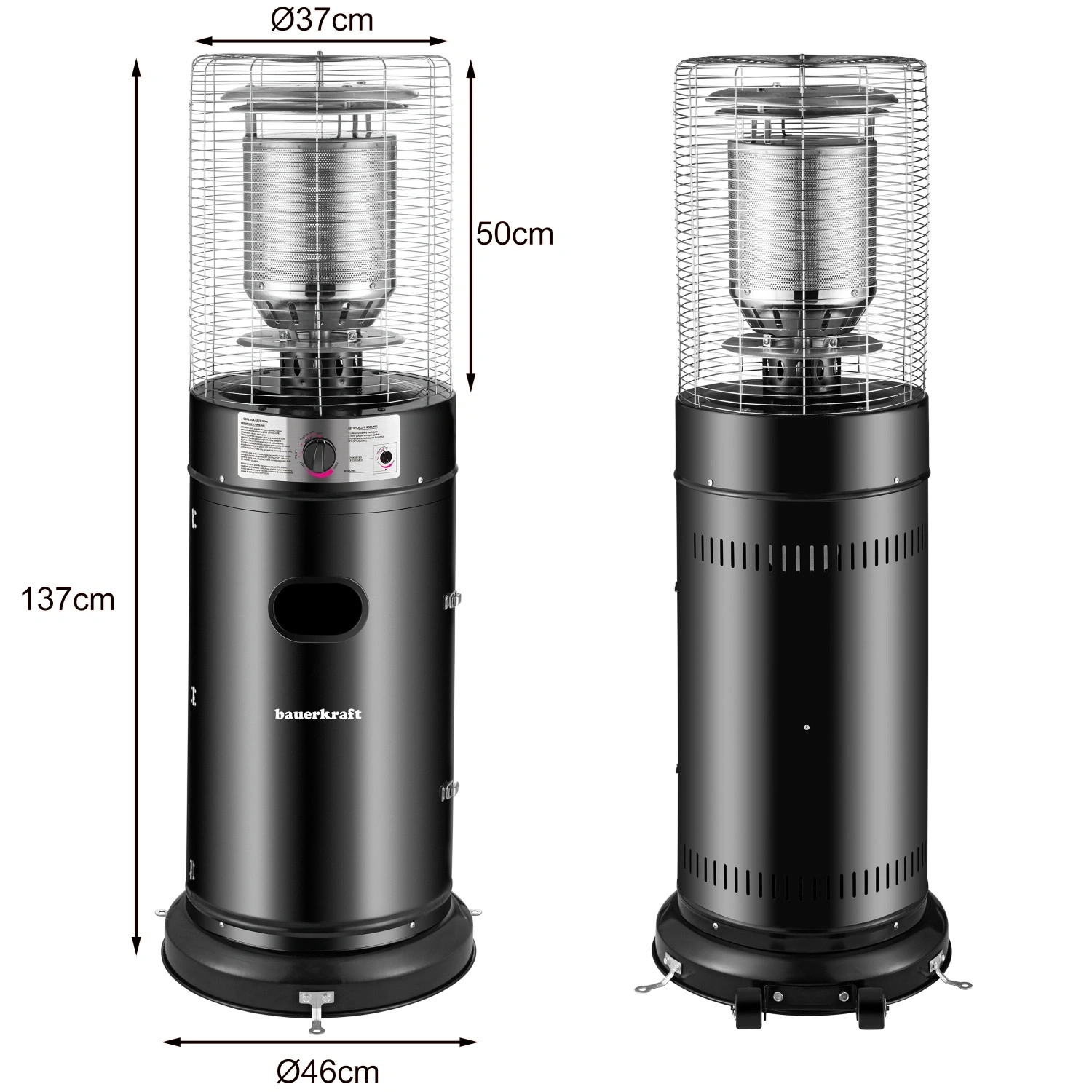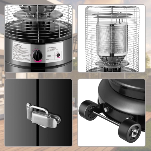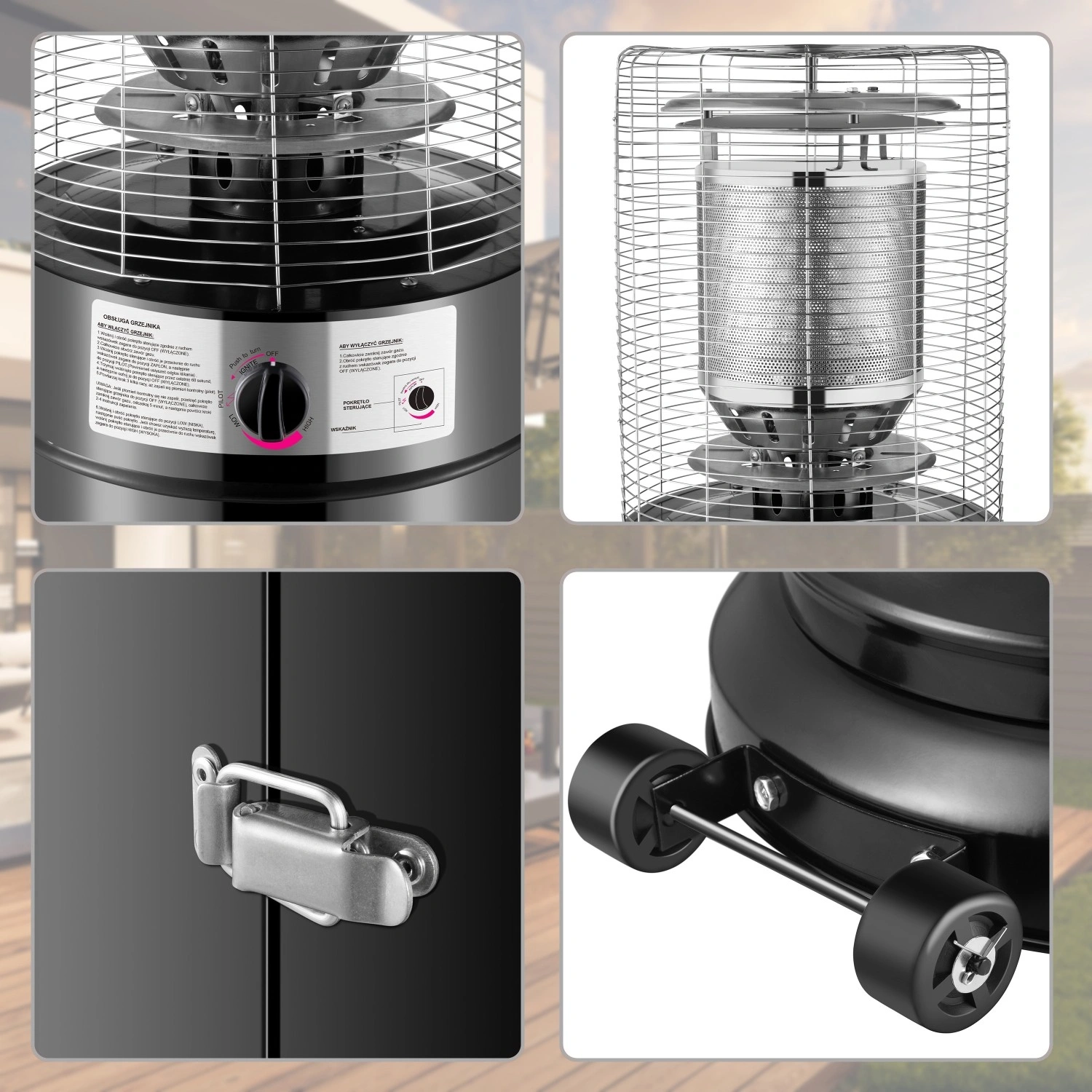 Deze gas-terrasverwarmer verandert je tuin of balkon in een comfortabele toevluchtsoord, zelfs bij frisser weer. Het moderne cilindrische design met een metalen behuizing en glazen omkasting past elegant in zowel privé- als commerciële ruimtes. Dankzij de efficiënte stralingswarmte biedt hij een aangename warmte tijdens samenzijn met familie en gasten.