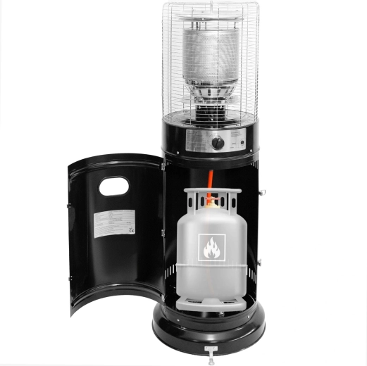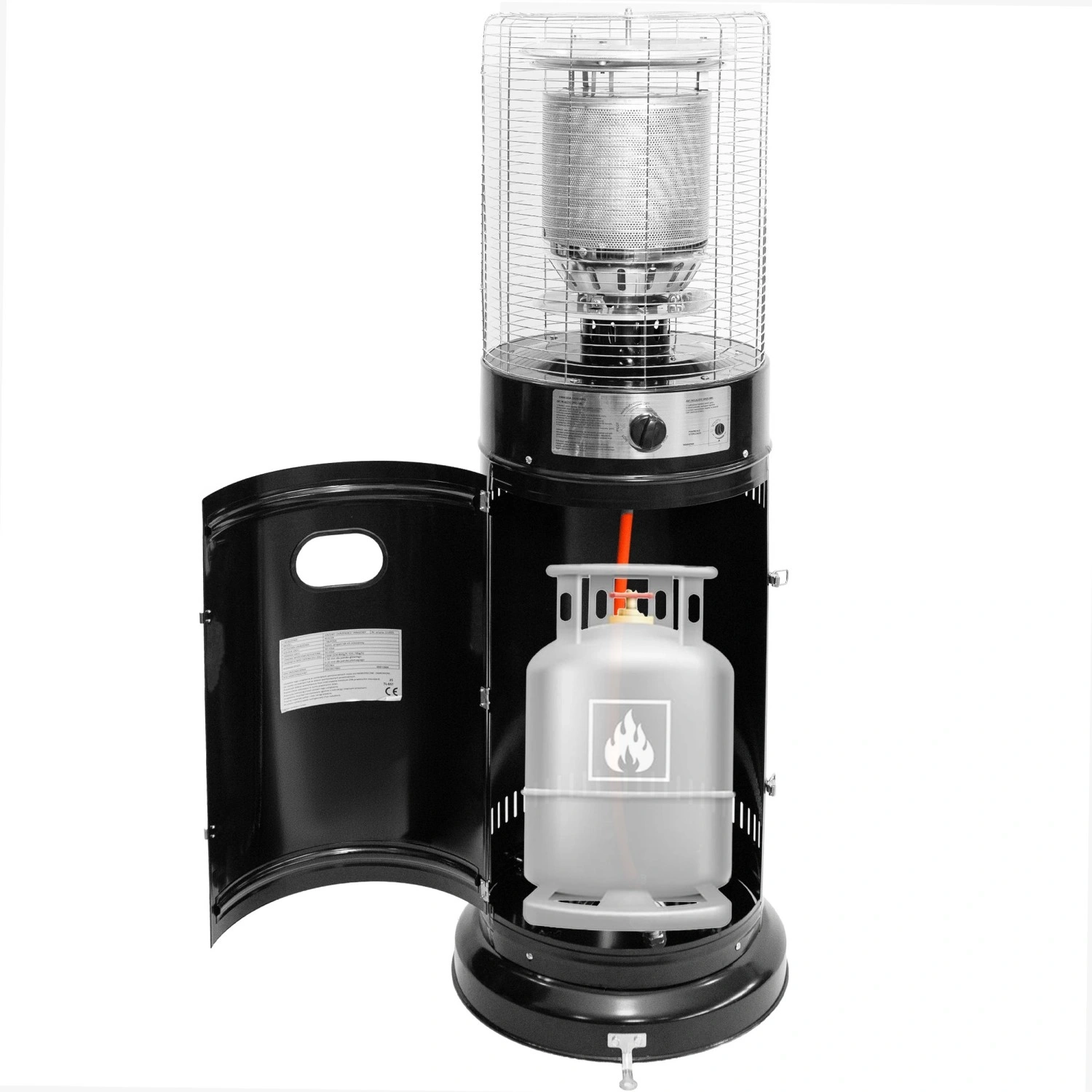 Afsluitbare ruimte voor een gasfles tot 11 kg en geïntegreerde wielen voor het gemakkelijk verplaatsen van de verwarmer naar behoefte.