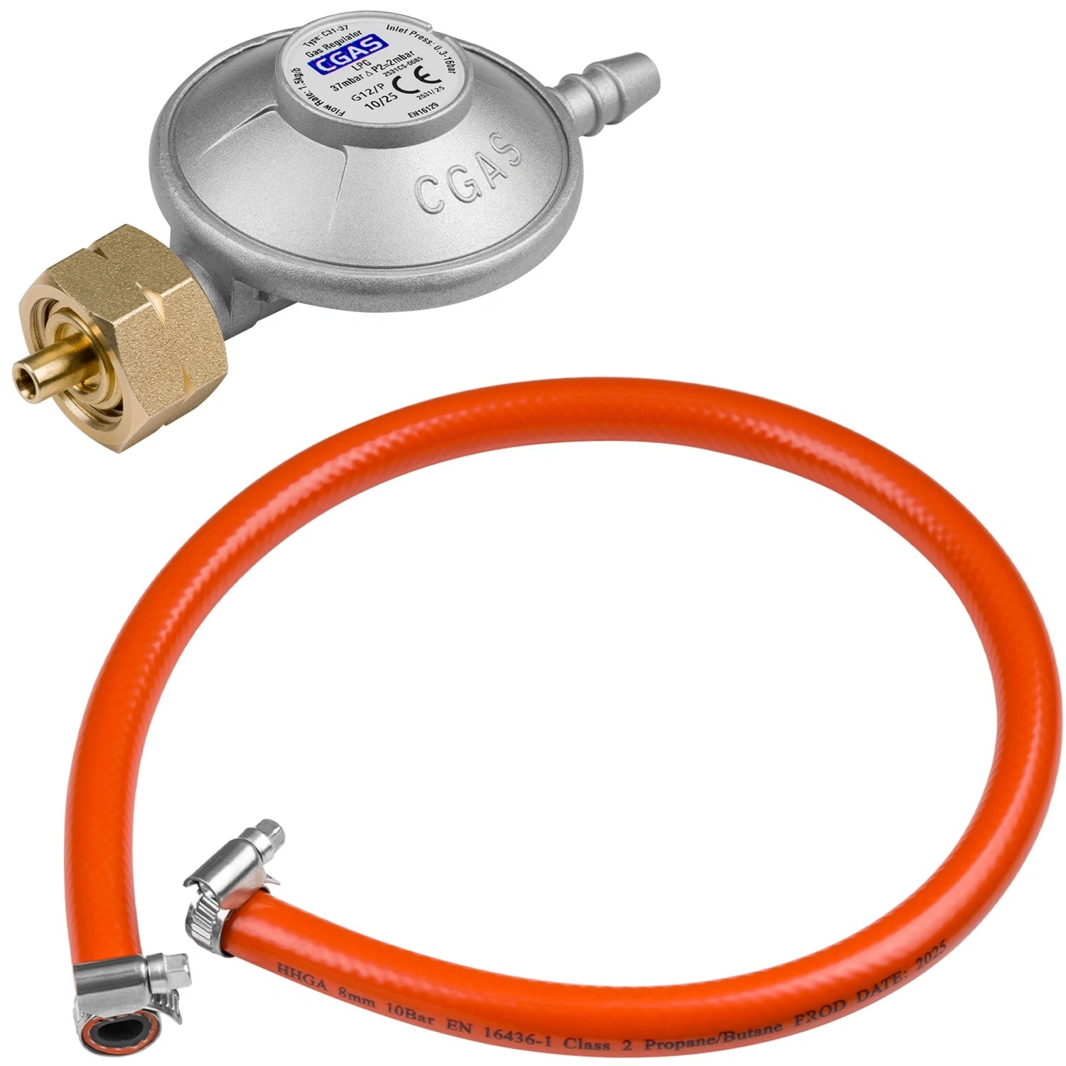 De set bevat een regelaar, gasslang met klemmen en een duurzame waterdichte hoes voor bescherming tijdens opslag.