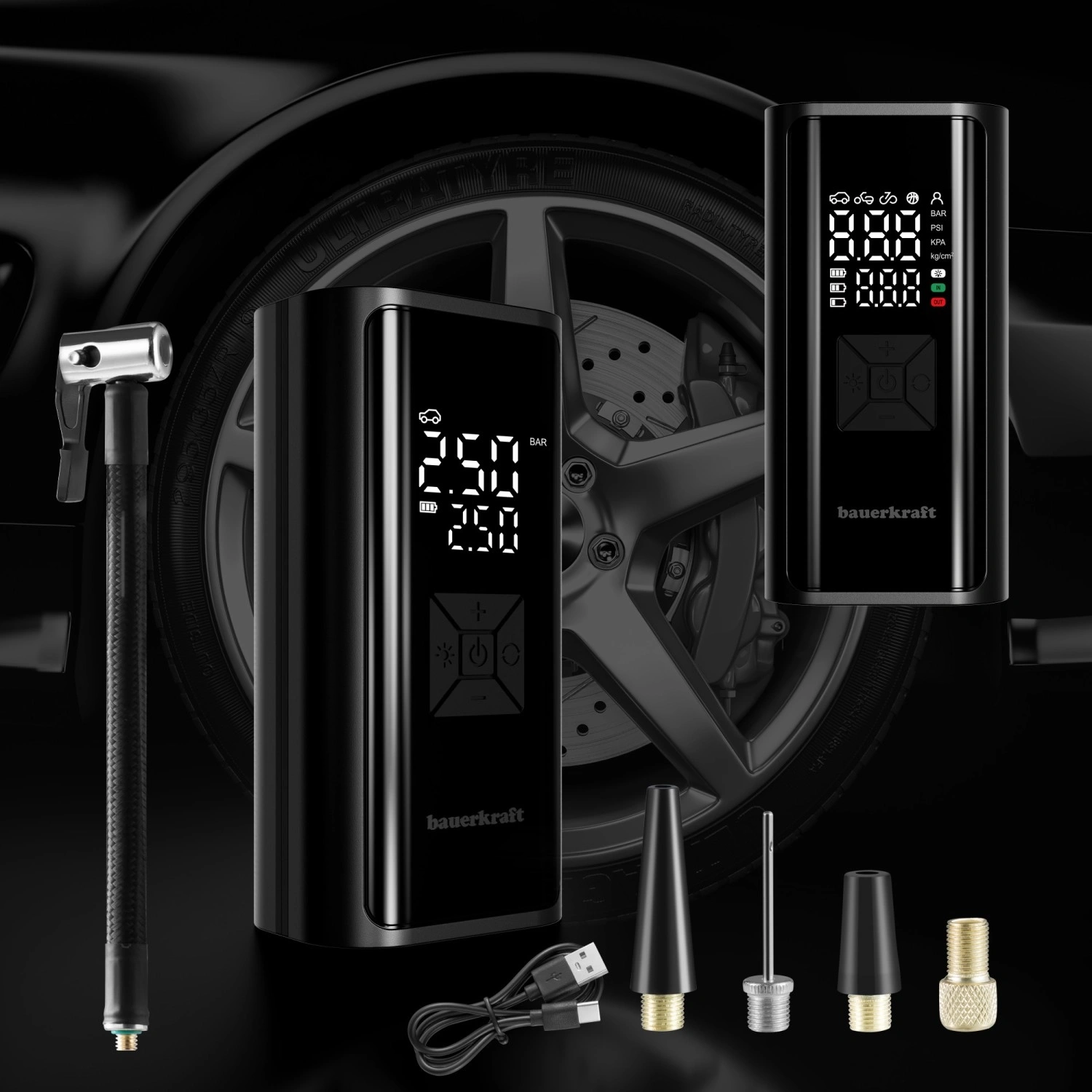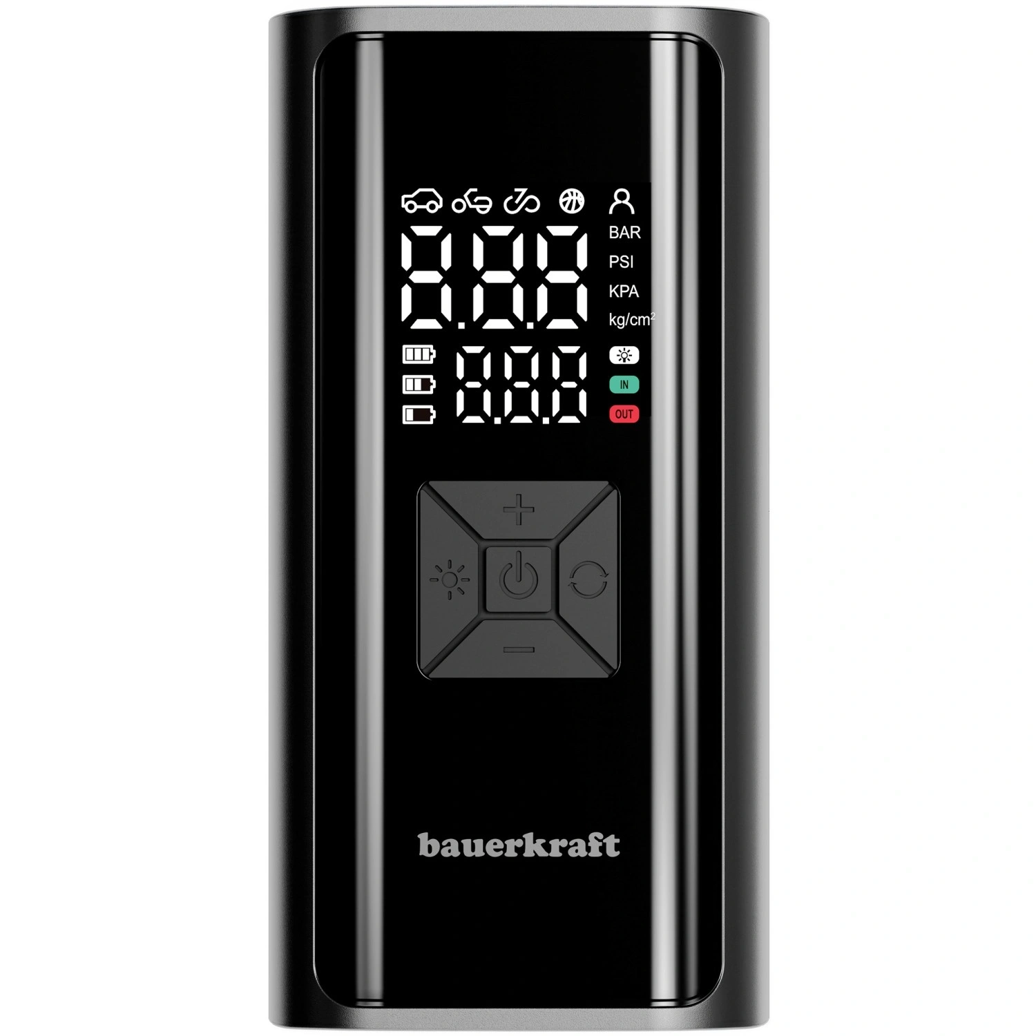 Volg de druk en de batterijstatus in realtime. Stel de doelwaarde in en de compressor schakelt automatisch uit zodra deze is bereikt – veilig en zonder overoppompen.