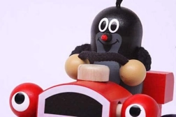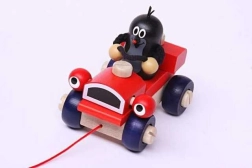 Houten montageauto met het motief van de Mol, die knippert tijdens het rijden. Geschikt voor plezier en de ontwikkeling van de motorische vaardigheden van kinderen.
